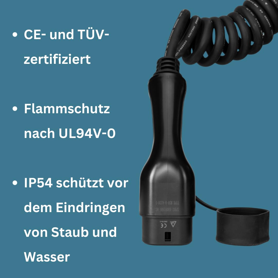 Lade dein E-Auto entspannt und sicher mit dem EVloaded Spiral-Ladekabel! Mit 11kW Ladeleistung (16A, 3-phasig) und 3m Länge ist es ideal für Zuhause oder unterwegs. Das spiralförmige Design ist super praktisch – es dehnt sich bei Bedarf und nimmt kaum Platz weg. Das Kabel ist IP54-geschützt, also absolut wetterfest, und hält Temperaturen von -30°C bis +50°C stand. TÜV- und CE-zertifiziert, mit Kupferkern und hoher Isolationsfestigkeit. Kompatibel mit vielen Modellen wie VW e-Golf, Nissan Leaf, BMW i3 und anderen europäischen E-Autos. Einfach einstecken, laden und losfahren – sicher, zuverlässig und alltagstauglich!