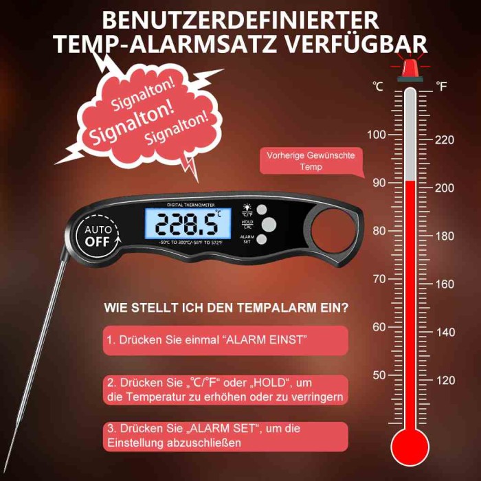 Grill-Profi werden war noch nie so einfach! Dieses digitale Thermometer mit 2 Fühlern misst Temperaturen von -20°C bis 300°C. Ein Fühler fürs Fleisch, einer für die Ofentemperatur. Großes LCD-Display mit Hintergrundbeleuchtung - auch nachts gut ablesbar. Kabellos mit 30-50m Reichweite. Timer mit Alarmfunktion warnt bei erreichter Temperatur oder Zeit. Perfekt für Grillen, BBQ, Backofen oder Camping. Batteriebetrieben (4x AAA, nicht enthalten). Mach dein Fleisch immer perfekt gar!