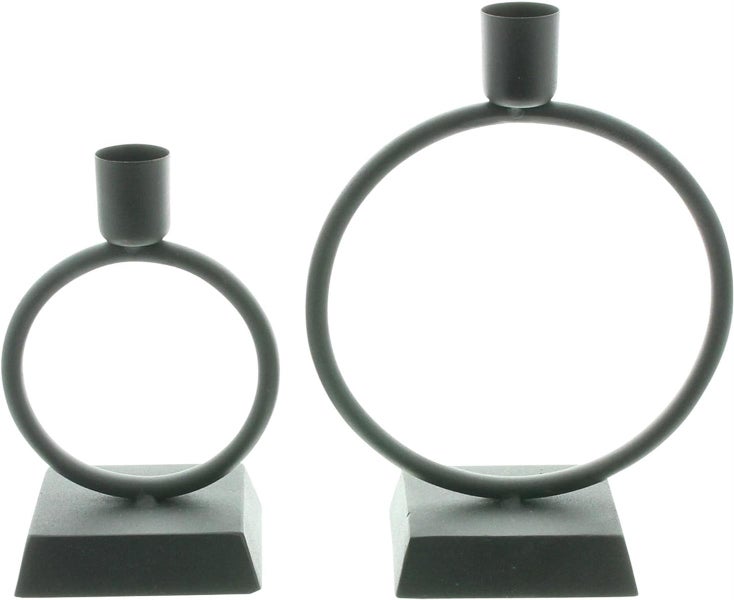 Gemütliche Atmosphäre garantiert! Diese beiden schwarzen Kerzenhalter aus Metall sehen nicht nur stylisch aus, sondern halten deine Stabkerzen auch sicher. Mit 7,6 cm Durchmesser und 3 cm Höhe passen sie perfekt auf jeden Tisch. Die matte Oberfläche ist pflegeleicht und rostet nicht. Ob im Wohnzimmer, beim romantischen Dinner oder als Weihnachtsdeko - sie machen überall was her. Für Stabkerzen bis 2,3 cm Durchmesser geeignet. Einfach Kerze reinstellen und entspannen!