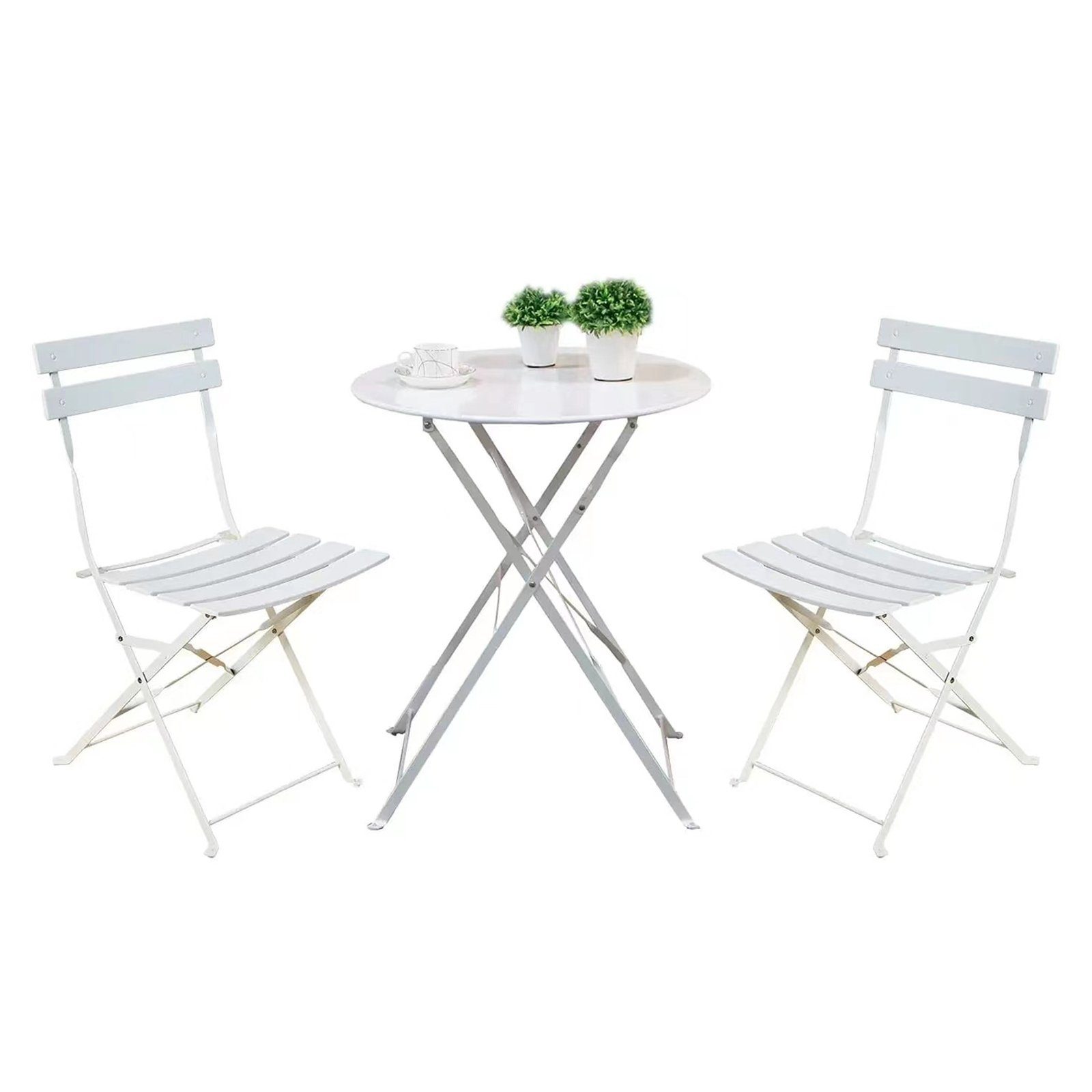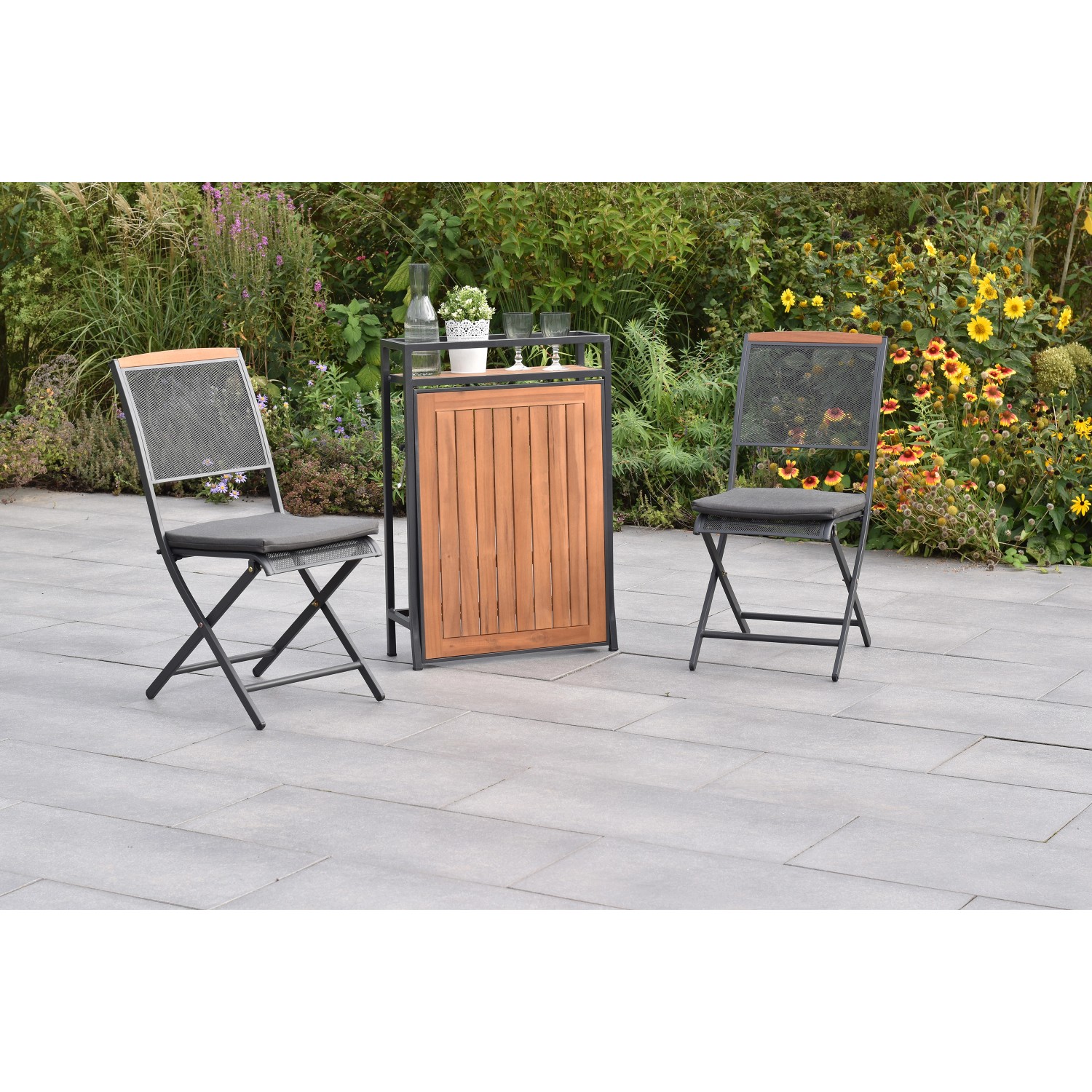 Perfektes Möbel-Set für kleine Balkone und Terrassen! Dieses filigrane Balkonset aus massivem Akazienholz findet überall Platz. Enthalten sind ein runder Tisch mit 57 cm Durchmesser und zwei bequeme Klappstühle mit Armlehnen. Nach Gebrauch einfach zusammenklappen und platzsparend verstauen - super praktisch! Der Tisch ist 72,5 cm hoch, die Stühle haben eine Sitzhöhe von 46 cm. Jeder Stuhl trägt bis zu 110 kg. Die natürliche Holzmaserung sieht einfach klasse aus und das Set ist witterungsbeständig. Ideal für gemütliche Frühstücke auf dem Balkon, Gartenpartys oder Camping-Ausflüge. Einfacher Aufbau, robuste Verarbeitung. Macht aus jedem kleinen Platz eine gemütliche Sitzgelegenheit!