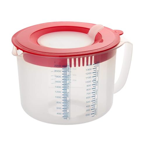 Mensch, dieser 3-in-1 Messbecher von mucHome ist ein echter Küchen-Alleskönner! Mit stolzen 2 Litern Fassungsvermögen und verschiedenen Messskalen für Mehl, Zucker, Reis und Flüssigkeiten wird das Abmessen zum Kinderspiel. Die Skalen zeigen ml, Liter, Pint und Flüssig-Unzen an - super praktisch für internationale Rezepte. Der transparente Kunststoff lässt dich immer sehen, was drin ist, und der Spritzschutz verhindert lästige Sauereien. Der Deckel ist perfekt zum Aufbewahren von Resten und der Ausgießer gießt wirklich tropffrei. Das Beste: Die gummiierte Unterseite sorgt für rutschfesten Stand, selbst wenn du kräftig rührst. Wichtig: Nur mit der Hand waschen, nicht für Spülmaschine oder Mikrowelle geeignet. Hergestellt in Europa in verschiedenen Farben - da hast du was Langlebiges für deine Küche. Ob für Kuchen backen, Soßen anrühren oder einfach nur Zutaten abmessen - mit diesem Helfer wird Kochen und Backen zum puren Vergnügen!