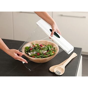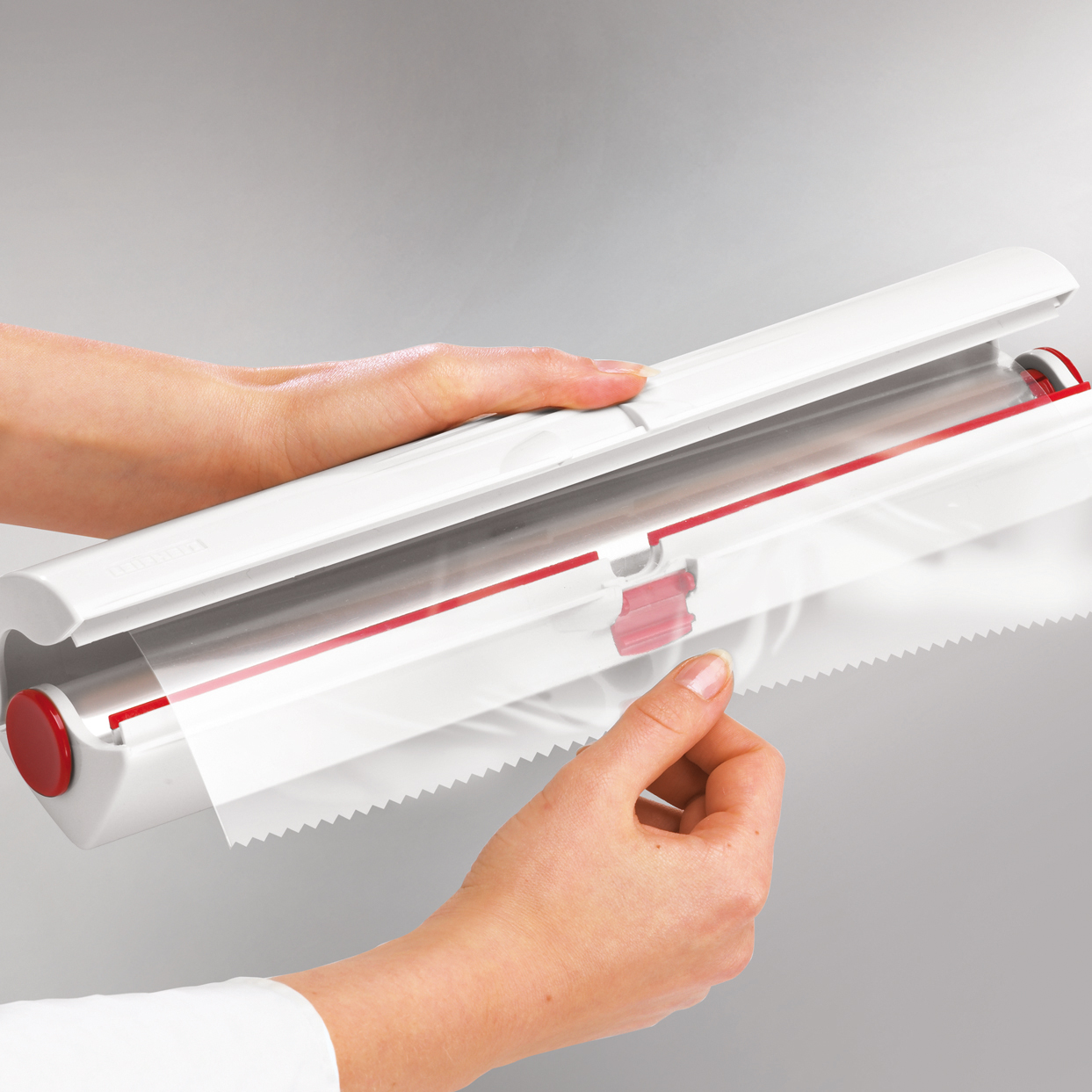 Mit magnetischem Boden - haftet am Kühlschrank und spart Platz. Integrierter Schneider schneidet die Folie sauber ab. Kein lästiges Zerreißen mehr!