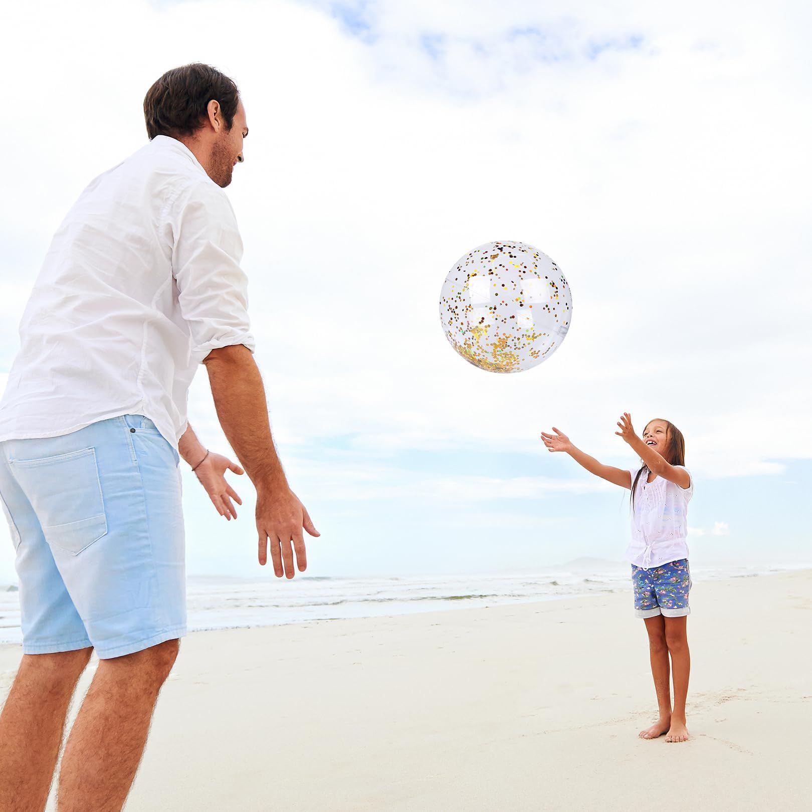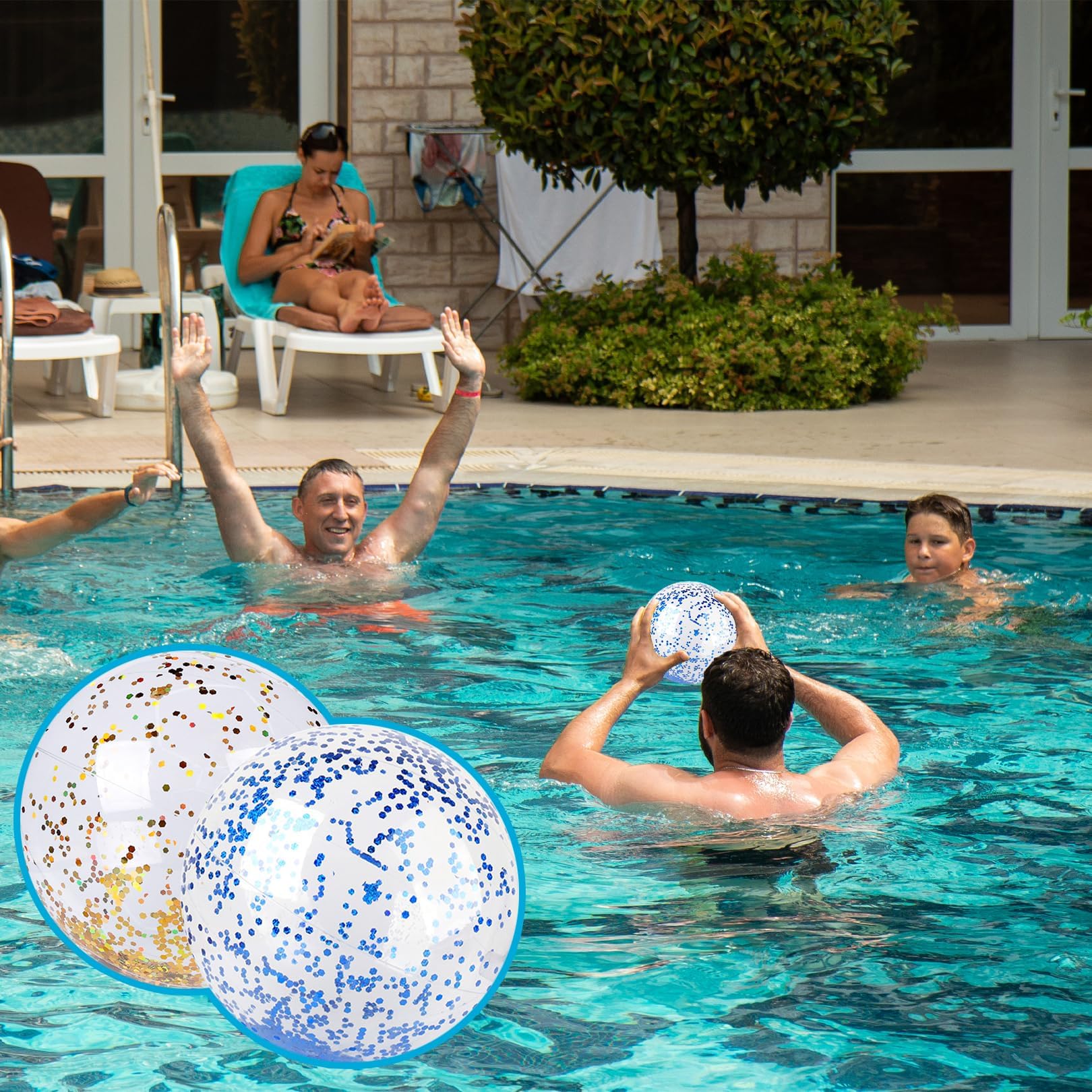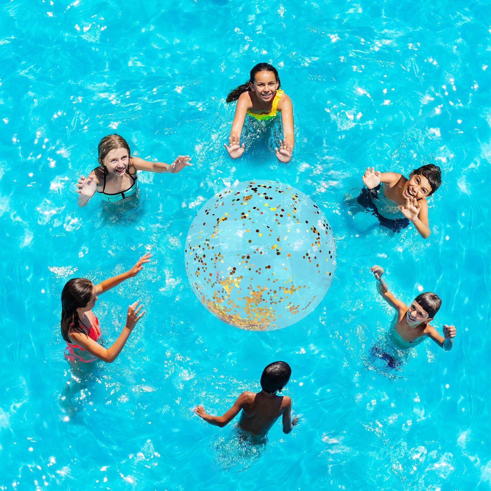 Richtig viel Spaß im Wasser! Diese beiden Glitzer-Wasserbälle bringen Action an jeden Strand und in jeden Pool. Mit 40cm Durchmesser sind sie perfekt für Spiele und zum Toben. Das besondere Feature: Der Glitter im transparenten Material funkelt wunderschön in der Sonne! Aus robustem, wasserfestem Kunststoff halten sie auch mal was aus und sind trotzdem weich und kindersicher. Einfach mit einer Luftpumpe aufblasen und schon kann's losgehen - ob beim Werfen und Fangen, Tauchen im Pool oder für coole Spiele am Strand. Für Kinder und Erwachsene gleichermaßen geeignet. Nach dem Spielen einfach die Luft rauslassen und platzsparend verstauen. Perfekt für den nächsten Strandausflug, die Gartenparty oder den Badeurlaub!