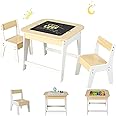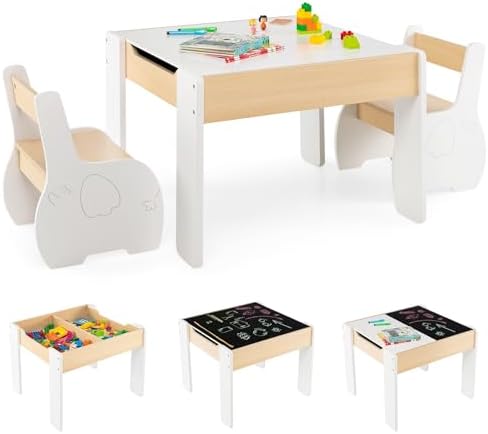 Der Traum jedes Kindes! Dieser FANTASK Kindertisch mit 2 Stühlen bietet alles für kreative Spielstunden. Die doppelseitige Tischplatte hat auf einer Seite eine Tafel und auf der anderen ein Whiteboard - malen, schreiben, immer wieder neu! Unter der Platte verbirgt sich praktischer Stauraum für Spielzeug und Stifte. Die ergonomischen Stühle mit Rückenlehne sorgen für bequemes Sitzen. Aus stabilem MDF mit abgerundeten Ecken für maximale Sicherheit. Maße: Tisch 60x60x49 cm, Stühle 31x29x45 cm. Für Kinder von 3-6 Jahren. Nach dem Spielen einfach die Stühle unter den Tisch schieben - platzsparend und ordentlich. Perfekt für Kinderzimmer, Kindergarten oder Spielzimmer. Förder Kreativität und Ordnungssinn!