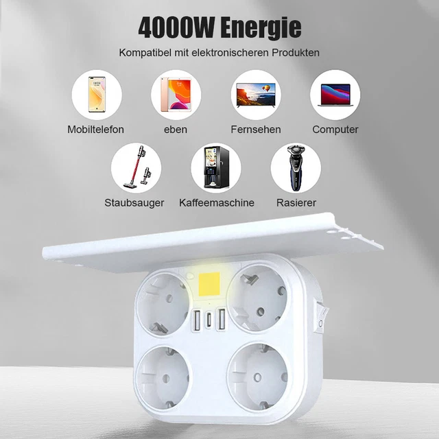 Der praktische Alleskönner für deine Steckdose! Dieser kompakte Steckdosenwürfel bietet 4 Schuko-Steckdosen (4000W/16A), 2 USB-A und 1 USB-C Anschluss - alles in einem! Perfekt für Büro, Wohnzimmer oder Küche wo Platz knapp ist. Einfach direkt in die Wandsteckdose stecken - kein lästiges Kabel! Der USB-C Port lädt deine modernen Geräte schnell und sicher. Mit praktischem Ein/Aus-Schalter sparst du Energie und schützt deine Geräte. Integrierte Kindersicherung und Überlastschutz sorgen für Sicherheit. Super für Fernseher, PC, Ladegeräte und Küchengeräte. Nie wieder Kabelsalat - alles schön ordentlich an einem Platz. Der moderne Würfel sieht dabei noch richtig gut aus! Perfekt auch für Reisen oder Hotelzimmer. Hol dir diese platzsparende Lösung für alle deine Strom- und Ladebedürfnisse!