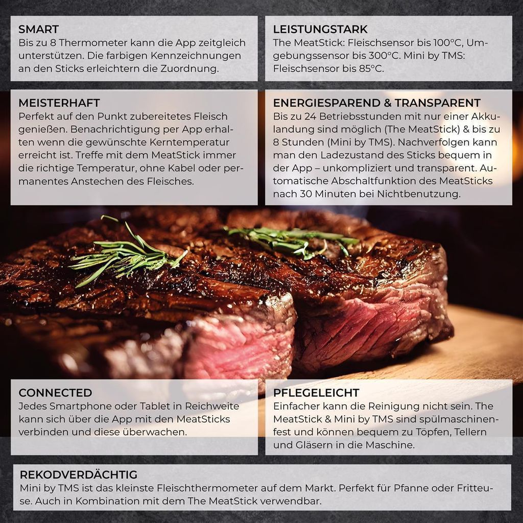 Grillfans, aufgepasst! Dieses MeatStick Set ist der absolute Gamechanger. Zwei Thermometer plus WiFi Bridge - damit kriegst du dein Fleisch immer perfekt hin. Die Bridge verbindet sich auf drei Arten: Bluetooth (bis zu 90 Meter!), im Heimnetzwerk oder übers Internet. Das Display zeigt dir alles an - Temperatur, Garzeit, sogar die Umgebungstemperatur. Super einfach zu bedienen, selbst wenn du nicht so technikaffin bist. Im Lieferumfang ist alles dabei: Ladegerät, Transporttasche, die zwei MeatSticks und die Bridge. Kannst du überall mitnehmen - ob Gartenparty, Camping oder einfach nur im heimischen Garten. Die Akkus halten ewig und laden schnell wieder auf. Besonders cool: Du kannst von überall checken, wie dein Grillgut aussieht. Musst nicht ständig daneben stehen. Echt praktisch für große Grillpartys oder wenn du mehrere Dinge gleichzeitig garen willst. Qualität spürt man sofort - das ist kein Billigzeug!