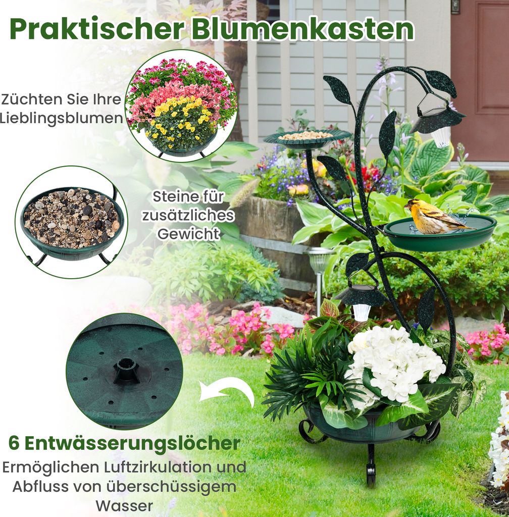 Mit dieser 2-in-1 Vogeltränke und Futterstation holst du dir Leben in deinen Garten! Das besondere Blatt-Design sieht nicht nur natürlich aus, sondern bietet Vögeln sowohl Platz zum Baden als auch zum Fressen. Mit einer Standhöhe von 83 cm und einer Blattgröße von 27x21 cm ist die Tränke perfekt dimensioniert. Aus robustem Eisen mit Sicherheitsbeschichtung gefertigt, ist sie wetterfest, rostfrei und korrosionsbeständig - hält also auch frostige Temperaturen problemlos aus! Der Zusammenbau ist super einfach: Einfach die 4 Stützstangen zusammensetzen, mit dem Laubbecken verbinden und die Schrauben festziehen - fertig in wenigen Minuten! Aufstellen kannst du die Tränke überall im Garten, auf der Terrasse, im Hof oder sogar in Blumentöpfen. So lockst du eine Vielzahl von Vögeln an, die nicht nur trinken und baden, sondern auch gleich noch etwas fressen können. Dein Garten wird zum lebendigen Treffpunkt für gefiederte Besucher! Die hohe Qualität und das durchdachte Design machen diese Vogeltränke zu einem echten Hingucker. Perfekt für alle Vogelliebhaber, die ihren Garten tierfreundlich gestalten wollen. Einfach aufstellen, mit Wasser und Futter befüllen und den Vögeln zuschauen!