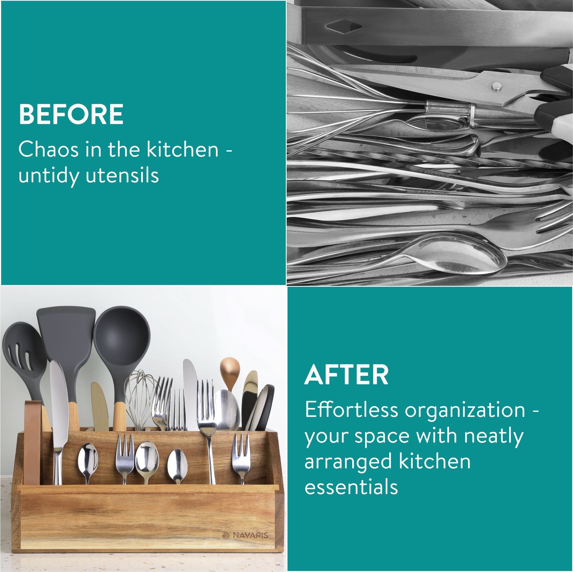 Schluss mit Chaos in der Küche! Dieser Vobumix Besteckhalter aus Edelstahl bringt Ordnung in deine Schubladen oder auf die Arbeitsplatte. Mit zwei Fächern hast du alles perfekt sortiert - Messer hier, Löffel da, Spatel woanders. Das offene Design mit den Abtropflöchern ist genial: Wasser kann einfach ablaufen, alles trocknet schnell und es bildet sich kein Schimmel. Aus hochwertigem 430 Edelstahl, rostfrei und super langlebig. Maße: 16,9x9x13,3cm - passt in fast jede Schublade. Sieht auch noch stylisch aus mit dem modernen mattsilbernen Look. Und das Beste: Reinigen ist ein Kinderspiel! Einfach unter fließend Wasser abspülen oder in die Spülmaschine. Endlich hast du deine Küchenutensilien im Griff und findest alles sofort. Ob für dich alleine oder die ganze Familie - dieser Organizer macht dein Küchenleben einfacher. Hol dir die Ordnung, die du verdienst!