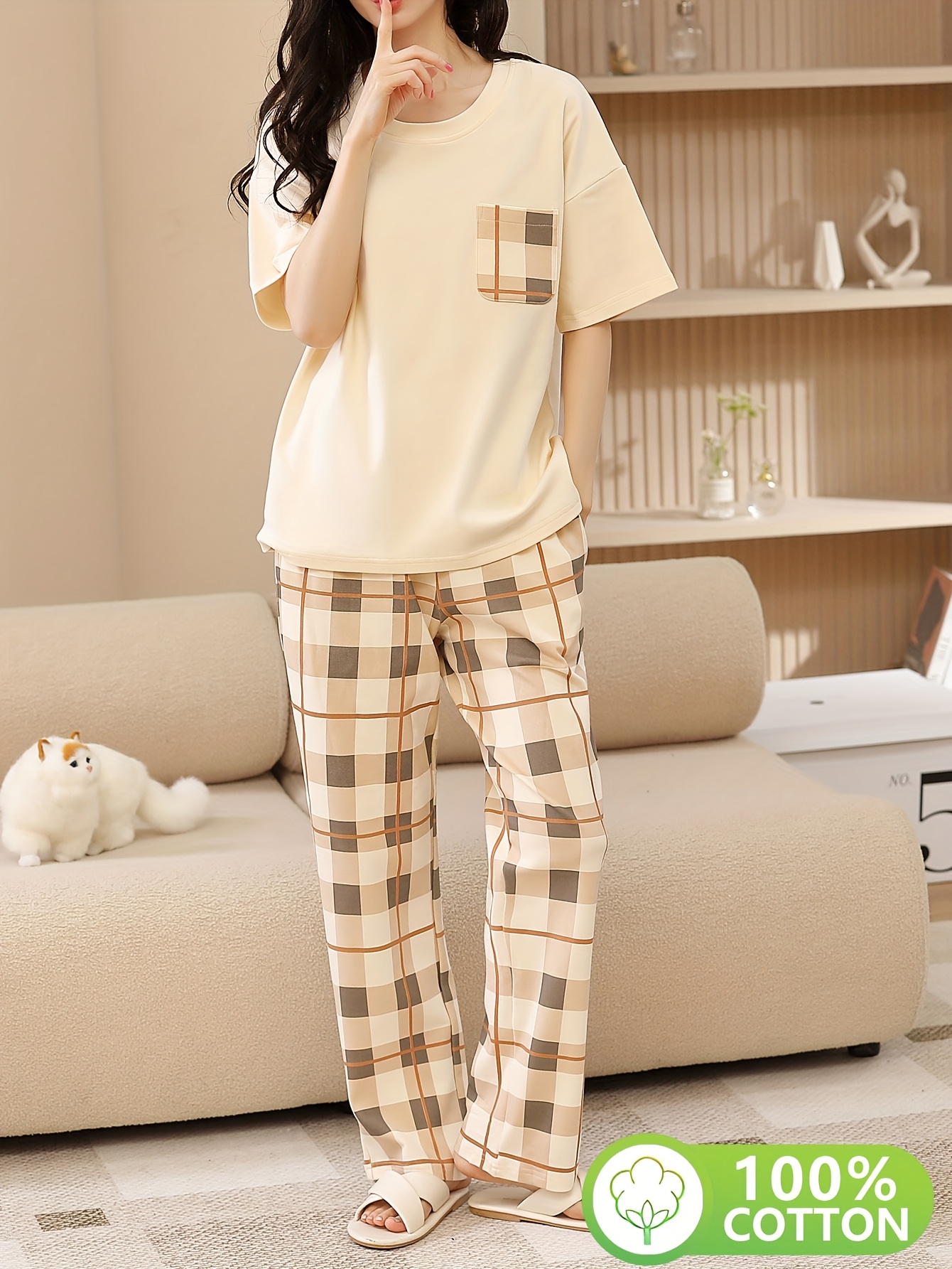 Gemütlichkeit pur! Dieser 2-teilige Damenschlafanzug aus weicher Baumwolle ist einfach perfekt zum Relaxen. Mit praktischen Taschen an der Hose - super fürs Handy oder Taschentücher. Der V-Ausschnitt und die Knopfleiste sehen klasse aus, und der Stoff ist angenehm auf der Haut. Weite Ärmel und flexible Nähte geben dir totale Bewegungsfreiheit. Ob zum Schlafen, Fernsehen oder für den Morgenkaffee - dieser Pyjama ist dein neuer Liebling! Wichtiger Tipp: Lieber eine Größe größer bestellen, denn er fällt etwas kleiner aus. Tolles Geschenk für Freundin, Schwester oder Tochter. Perfekte Nachtwäsche für kalte Winterabende!