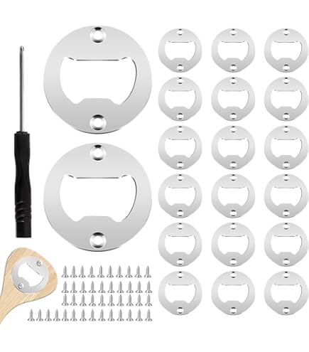Mit diesem DIY-Set kannst du deine eigenen individuellen Flaschenöffner basteln! 20 Stück Edelstahl-Rohlinge mit 40 mm Durchmesser, dazu Schrauben und ein Schraubendreher - alles was du brauchst. Einfach auf Holz, Metall, Kunststoff oder Harz schrauben und schon hast du deinen persönlichen Flaschenöffner. Die großen Rillen machen das Öffnen von Flaschen super einfach, kein Herumgefummel mehr. Aus rostfreiem Edelstahl, also korrosionsbeständig und langlebig. Perfekt für Hausbars, als Geschenk oder für Bastelprojekte. Ob mit Gravur, bemalt oder naturbelassen - deiner Kreativität sind keine Grenzen gesetzt. Einfach schrauben, festziehen und schon kann's losgehen mit dem Flaschenöffnen!