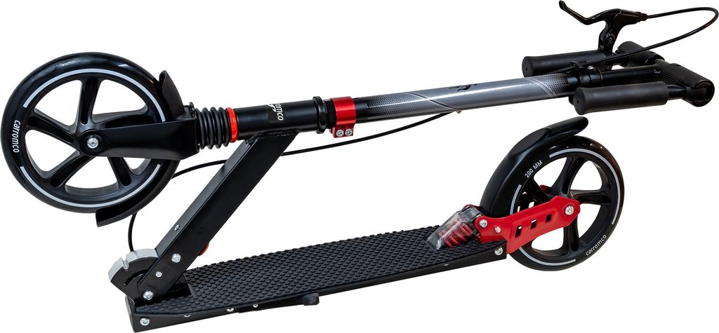 Ready for some Scooter-Action? Der Carromco Lugano 200 ist dein perfekter City-Begleiter! Klappbar mit 1-Klick-Mechanismus - super praktisch für Bus und Bahn. Höhenverstellbarer Lenker von 87,5-102,8 cm - passt für Kinder ab 8 Jahren (135 cm) und Erwachsene bis 100 kg. Große 200mm PU-Reifen mit ABEC-7 Lagern und Federung vorne/hinten - fährt sich wie auf Wolken! Handbremse und Hinterradbremse für doppelte Sicherheit. Aus robustem Aluminium, nur 5,6 kg leicht. Mit Seitenständer und Spritzschutz. Maße: 99x48x103 cm aufgeklappt, gefaltet nur 84x18x35 cm. EN14619 zertifiziert - geprüfte Qualität. Ob zur Schule, Arbeit oder für Freizeit-Touren - dieser Roller macht einfach Laune!