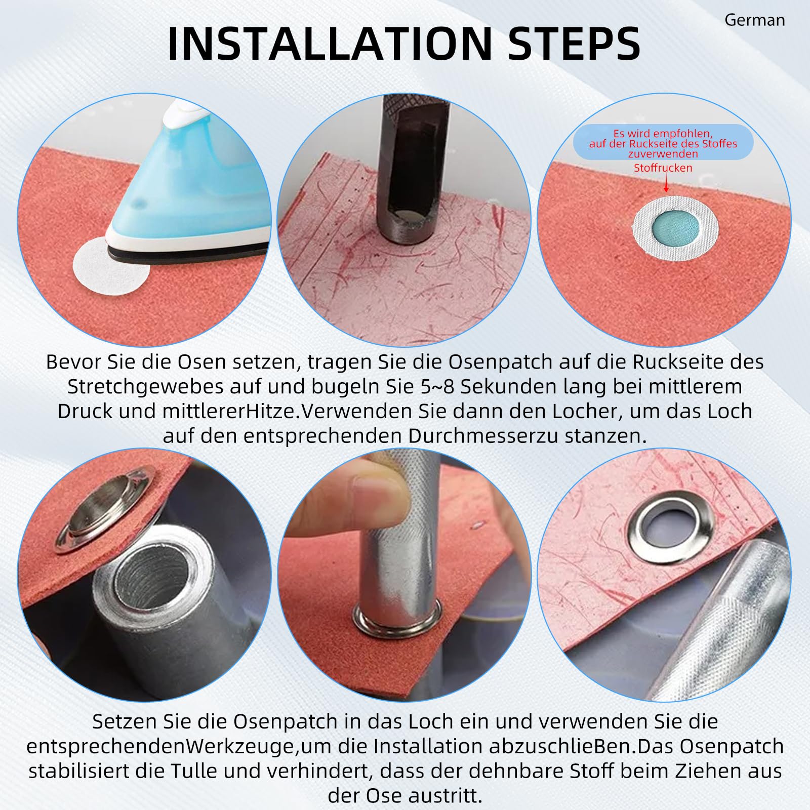Schluss mit ausgerissenen Ösen an deiner Lieblingskleidung! Diese praktischen Bügelflicken retten deine Jacken, Hosen und Zelte in Sekundenschnelle. Einfach das Schutzpapier abziehen, aufbügeln und fertig - kein Nähen nötig! \\n\\nDie 20mm großen Patches stabilisieren die Ösen perfekt und verhindern, dass der Stoff weiter ausreißt. Selbst nach dem Waschen halten sie bombenfest - und falls nötig, kannst du sie einfach nochmal aufbügeln. \\n\\nPerfekt für Outdoor-Ausrüstung, Daunenjacken, Arbeitshosen oder sogar Socken. Mit 200 Stück im Set bist du für alle Reparaturfälle bestens gerüstet! \\n\\n• 200 Stück Ø 20mm \\n• Einfach aufbügeln \\n• Maschinenwaschbar \\n• Für alle Stoffe geeignet \\n• Stabilisiert ausgerissene Ösen