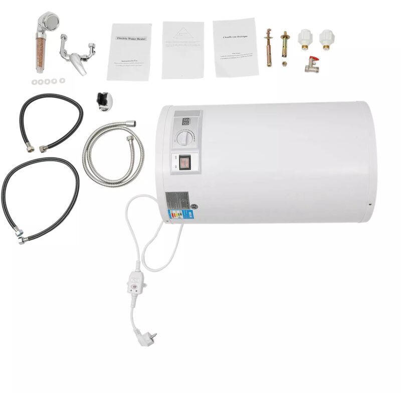 Endlich immer warmes Wasser! Dieser 50-Liter Boiler mit 2000W Leistung versorgt dich zuverlässig mit heißem Wasser. Perfekt für Küche, Bad oder sogar den Friseursalon.\n\nTechnische Daten:\n• Fassungsvermögen: 50 Liter\n• Leistung: 2000 Watt\n• Spannung: 220V\n• Temperaturbereich: 25-75°C\n• Nenndruck: 0.7 MPa\n• IPX4 wasserdicht\n\nIm Lieferumfang ist alles dabei, was du brauchst: Der Boiler selbst, ein praktischer Wasserhahn, eine Handbrause und alle nötigen Schläuche. Sogar die Montagezubehörteile sind mit dabei!\n\nSicherheitsfeatures:\n• Automatische Abschaltung bei Leckage\n• Trockenbrandschutz\n• Stabile Wandmontage\n\nDer Boiler besteht aus rostfreiem Stahl mit Emaille-Beschichtung - das garantiert Langlebigkeit. Die digitale Temperaturanzeige macht die Bedienung super einfach. Einfach die gewünschte Temperatur einstellen und schon kommt warmes Wasser!\n\nWichtig: Immer erst mit Wasser füllen, dann einschalten. Und regelmäßig entkalken nicht vergessen. So hast du jahrelang Freude an deinem neuen Warmwasserspeicher!