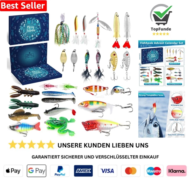 Die Vorfreude auf Weihnachten und das Angeln vereint! Dieser geniale Adventskalender für Angler macht den Countdown zum Fest unvergesslich! 24 Überraschungsboxen enthüllen täglich neues Angelzubehör - von praktischen Werkzeugen bis zu hochwertigen Ködern! Enthalten ist eine 1,9m Angelrute aus hochdichter Kohlefaser, leicht und dennoch extrem stabil! Dazu eine sensible Angelrolle Typ 200, die auch mit großen Fischen problemlos zurechtkommt! Verschiedene Ködertypen wie Hartköder, Weichköder und Paillettenköder decken alle Angel-Situationen ab! Mit 3D-Augen und realistischen Fischstrukturen lockst du deine Beute garantiert an! Perfekt für Meeres-, Fluss- oder Seeangeln - ob Anfänger oder Profi! Enthält alles, was man braucht: Zangen, Fisch-Controller, Lippenchips, Maßbänder und vieles mehr! Ein ideales Geschenk für Papa, Opa, Freunde oder alle Angelbegeisterten! Mach die Weihnachtszeit zur spannenden Vorbereitung auf die nächste Angelsaison! Hol dir jetzt diesen einzigartigen Kalender und erlebe 24 Tage Angel-Spaß!