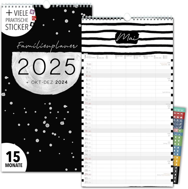 Endlich Ordnung im Familienchaos! Dieser stylische Familienkalender 2026 hat 5 Spalten für bis zu 5 Personen - perfekt für Familien, WGs oder Büros. In schickem Schwarz-Weiß Design mit 15 verschiedenen Motiven wird er zum echten Hingucker an der Wand. Maße: 23x43cm - gut sichtbar aber nicht zu aufdringlich. Mit 330 bunten Stickern für Geburtstage, Termine, Urlaub und mehr. Besonders praktisch: die Ferienleiste pro Monat und der separate Ferien-Flyer für den Kühlschrank. Enthält sogar Vorschau auf Okt-Dez 2025, Jahresübersicht und Pflanzkalender. Einfach aufhängen und das Familienmanagement wird zum Kinderspiel - nie wieder Termine vergessen!