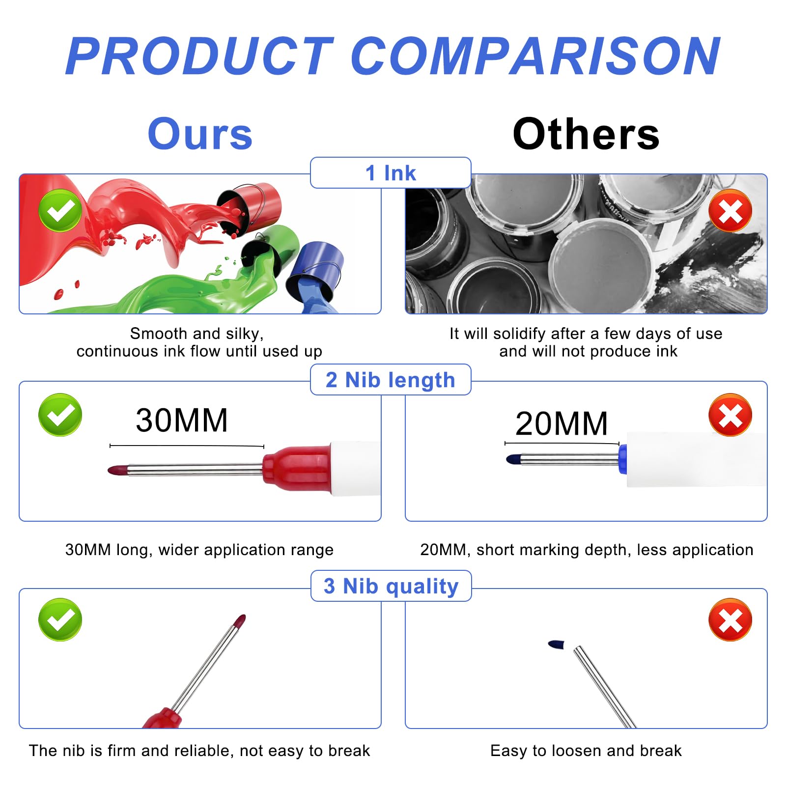Kennst du das? Du willst ein tiefes Loch markieren, aber dein normaler Stift kommt nicht rein? Mit diesen Tieflochmarkern ist das kein Problem mehr! Die extra langen 20 mm Spitzen erreichen auch enge und tiefe Löcher problemlos. Das Set enthält 8 Stifte in 4 praktischen Farben: Rot, Schwarz, Blau und Weiß - perfekt für verschiedene Materialien und Zwecke. Die Tinte ist wasserfest und trocknet schnell, geht also nicht so leicht verschmiert. Praktisch: Am Stift ist ein Lineal integriert, sodass du gleich die Maße abnehmen kannst. Und mit dem Stiftclip nimmst du sie überall mit - einfach an die Tasche stecken. Super für Handwerker, Heimwerker und Profis. Egal ob Metall, Holz, Kunststoff oder Wände - diese Marker machen auf allen Oberflächen klare Markierungen. Perfekt für Bohrungen, Montagen oder Reparaturen. Die ergonomische Form liegt gut in der Hand und ermüdet nicht bei längerem Gebrauch. Auch für feinste Arbeiten bestens geeignet. Die Farben sind gut deckend und auch auf dunklen Untergründen gut sichtbar. Ein unverzichtbares Werkzeug in jeder Werkstatt! Die Qualität überzeugt - die Spitzen sind stabil und brechen nicht so leicht ab. Mit diesem Set bist du für jede Markieraufgabe bestens ausgerüstet. Einfach praktisch!