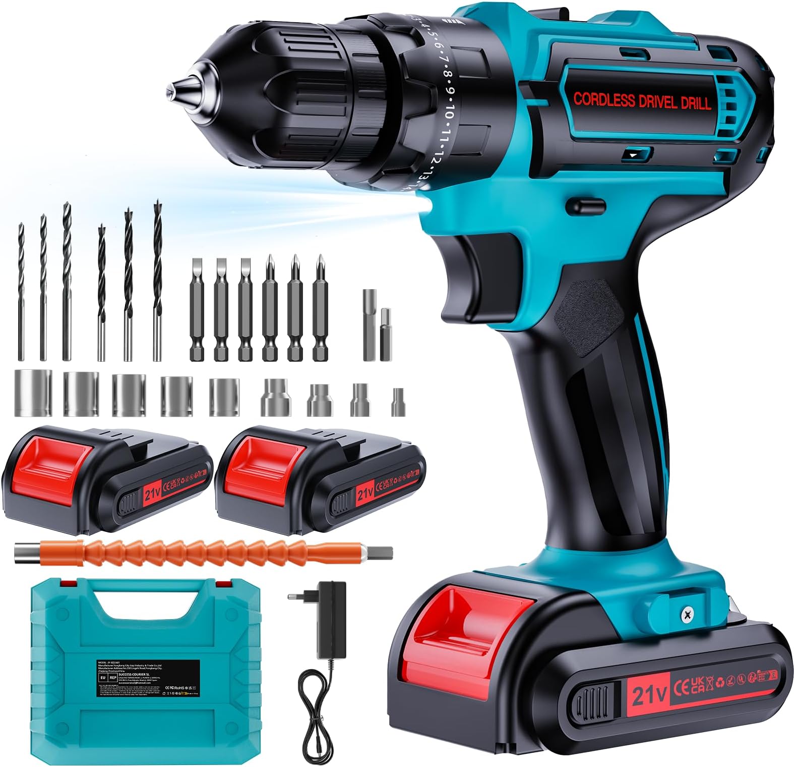 Perfekter Helfer für alle Heimwerker-Projekte! Dieser Akkuschrauber mit 21V und satten 45Nm Drehmoment packt wirklich jede Aufgabe an. Mit 2 Akkus à 2000mAh (zusammen 4000mAh) hast du immer genug Power - und die laden in nur 60 Minuten wieder voll auf. 2-Gang Getriebe, 25+3 Drehmomentstufen und LED-Beleuchtung machen die Arbeit zum Kinderspiel. Das Komplett-Set enthält alles was du brauchst: 6 Schraubendreher, 3 Holzbohrer, 3 Metallbohrer, 1 Fliesenbohrer und vieles mehr. Ob Möbel montieren, Regale aufhängen oder im Garten arbeiten - mit diesem Set bist du bestens ausgerüstet. Inklusive 3 Jahre Garantie - kaufen ohne Risiko!