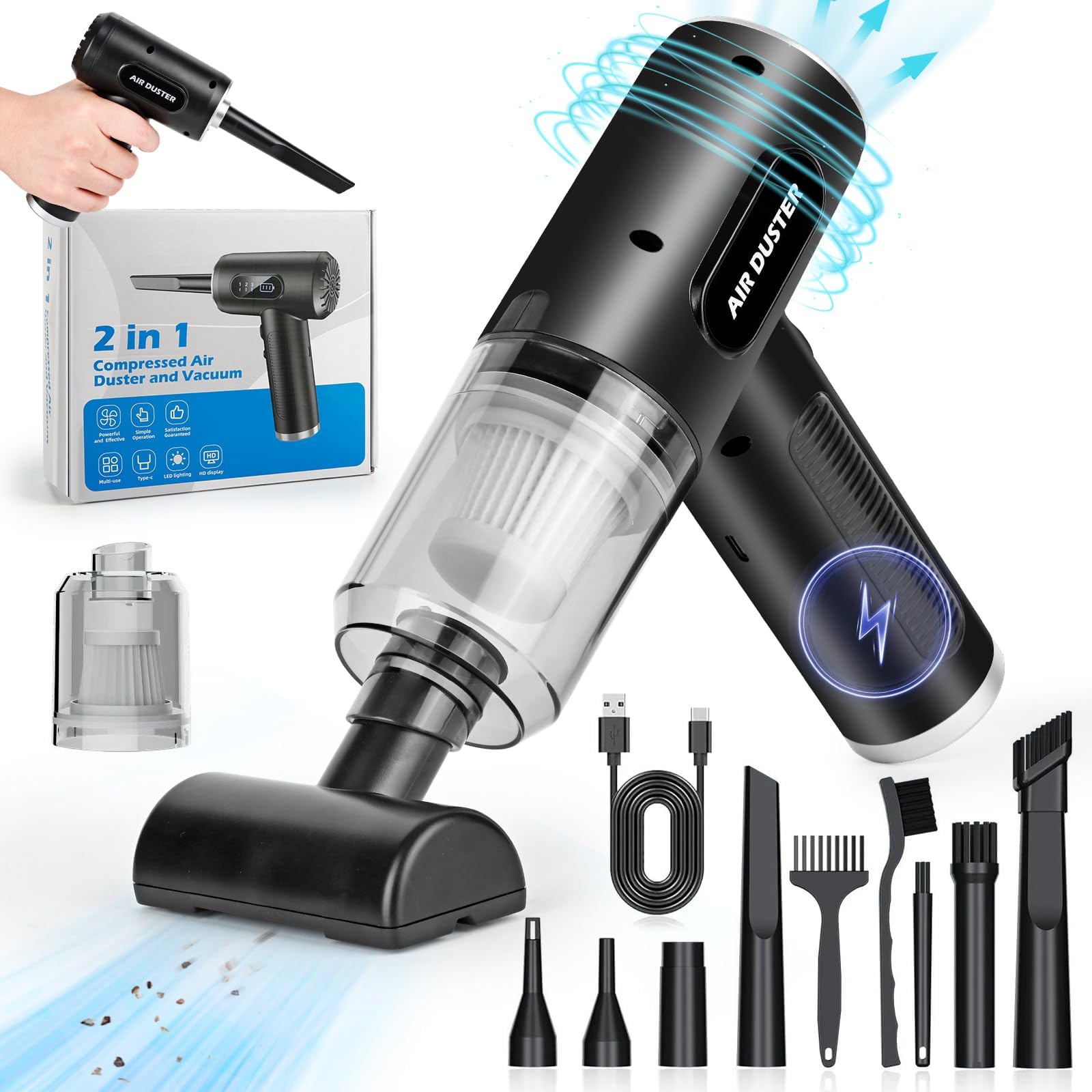 Dieser kabellose Handstaubsauger macht das Saubermachen zum Kinderspiel! Mit 22000Pa Saugkraft und 80.000 U/min entfernt er mühelos Staub, Krümel und Tierhaare. Der 3x2000mAh Akku bietet bis zu 30 Minuten Laufzeit und lädt in 3 Stunden per USB auf. Mit 8 praktischen Aufsätzen für alle Reinigungsaufgaben - ob im Auto, Büro oder zu Hause. Der HEPA-Filter fängt selbst Feinstaub zuverlässig ein und ist leicht zu reinigen. Leiser als 80dB, also perfekt für Familien mit Kindern oder Haustieren. Endlich Ordnung, wo immer du sie brauchst!