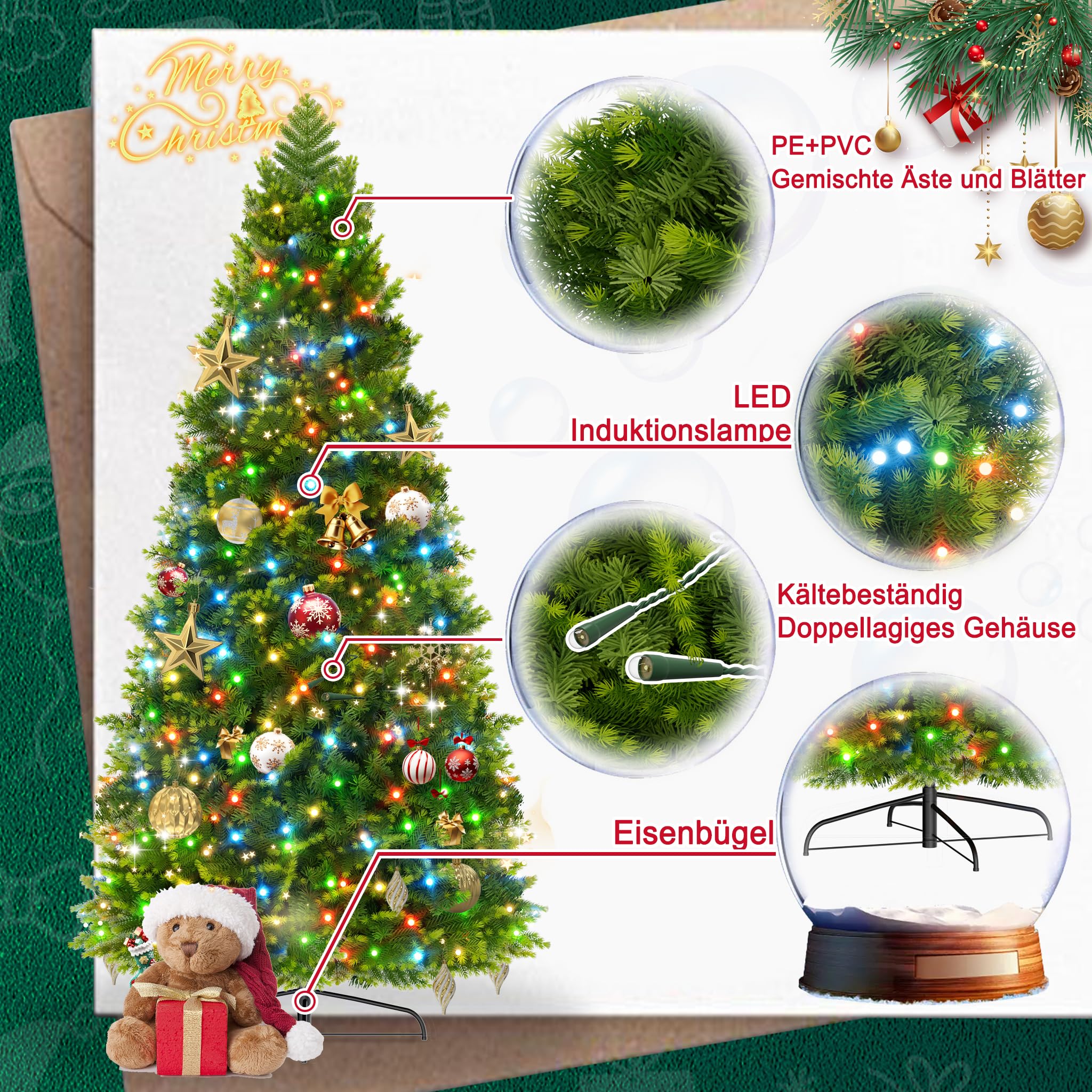Oh Tannenbaum, oh Tannenbaum - wie schön sind deine LEDs! Dieser Aufun-Weihnachtsbaum bringt Weihnachtsstimmung pur ins Haus. Stolze 225cm hoch, mit ultra-realistischen PVC- und PE-Zweigen, die sich kaum vom Original unterscheiden. 1100 Zweigspitzen sorgen für eine volle, dichte Optik - einfach traumhaft! Die 450 warmweißen LEDs sind schon integriert und sorgen für gemütliches Licht ohne lästiges Lichterkette-Schlangeln. Das Klappsystem macht den Aufbau super einfach - keine einzelnen Äste mehr stecken! Mit natürlichen Weiß-Schneeflocken wirkt er wie frisch verschneit. Energiesparend, langlebig und year after year einsetzbar. Nach Weihnachten platzsparend verstauen - kein Nadeln, kein Gießen! Der stabile Metallständer gibt sicheren Halt. Ob im Wohnzimmer, Büro oder Eingangsbereich - dieser Baum ist der absolute Hingucker. Weihnachten kann kommen!