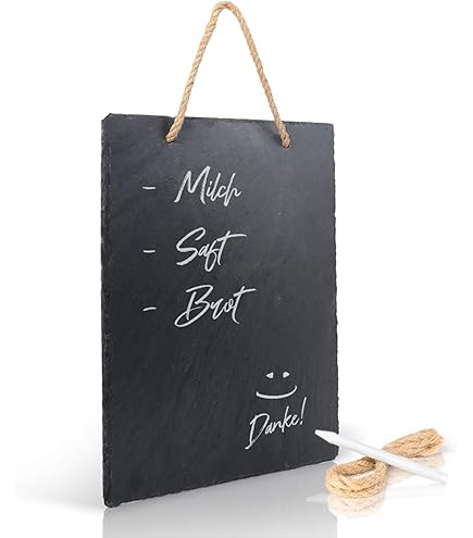 Echt retro - echt schön! Diese originale Schiefertafel im natürlichen Holzrahmen bringt rustikalen Charme in dein Zuhause oder Büro. Das Set ist komplett mit einem echten Schiefergriffel und einem praktischen Tafellappen - alles was du brauchst, um sofort loszulegen. Die Schieferoberfläche bietet die perfekte Fläche zum Schreiben und Zeichnen, jede Tafel ist durch die natürliche Maserung ein Unikat. Der stabile Holzrahmen sorgt für Langlebigkeit und unterstreicht den natürlichen Look. Super vielseitig einsetzbar: Als Notiztafel in der Küche, für kreative Skizzen im Arbeitszimmer, als Menütafel für besondere Anlässe oder einfach als dekoratives Element in deinem Wohnraum. Die Tafel lässt sich ganz leicht reinigen - einfach abwischen und neu beschreiben. Perfekt für alle, die das Besondere lieben und ihren Räumen eine persönliche Note verleihen wollen. Ob für praktische Notizen oder als stylisches Deko-Objekt - diese Schiefertafel macht einfach überall eine gute Figur!