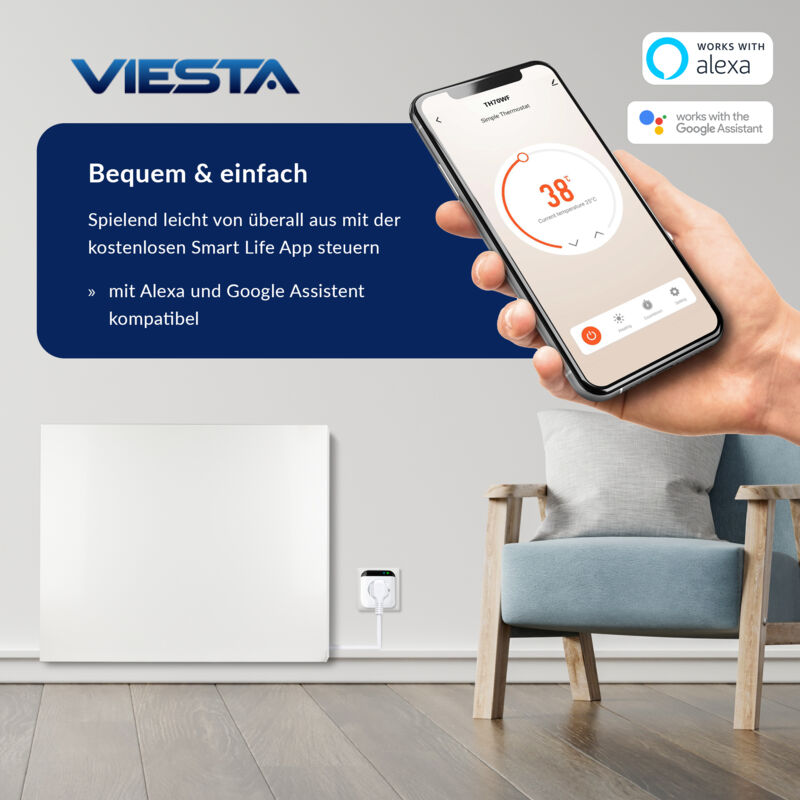 Mach deine Heizung smart! Der TH70 WiFi Steckdosenthermostat verwandelt jede einfache Elektroheizung in ein intelligentes Heizsystem. Einfach in die Steckdose stecken, Heizgerät anschließen und per Smart Life App (iOS/Android) steuern. Mit Alexa und Google Assistant Sprachsteuerung möglich - sag einfach 'Alexa, mach die Heizung an'! Temperaturbereich von -20°C bis +100°C für präzise Regelung. Programmierbare Wochenpläne mit bis zu 4 Heizphasen pro Tag sparen Energie und Geld. 230V/3450W Leistung für fast alle Elektroheizungen, Infrarotpaneele, Radiatoren und mehr. Integrierter Überlastschutz, Kindersicherung und Überhitzungsschutz für maximale Sicherheit. CE zertifiziert und IP20 Schutzklasse. Perfekt fürs Home-Office, Wohnzimmer oder als Zusatzheizung. Plug & Play - keine Installation nötig!