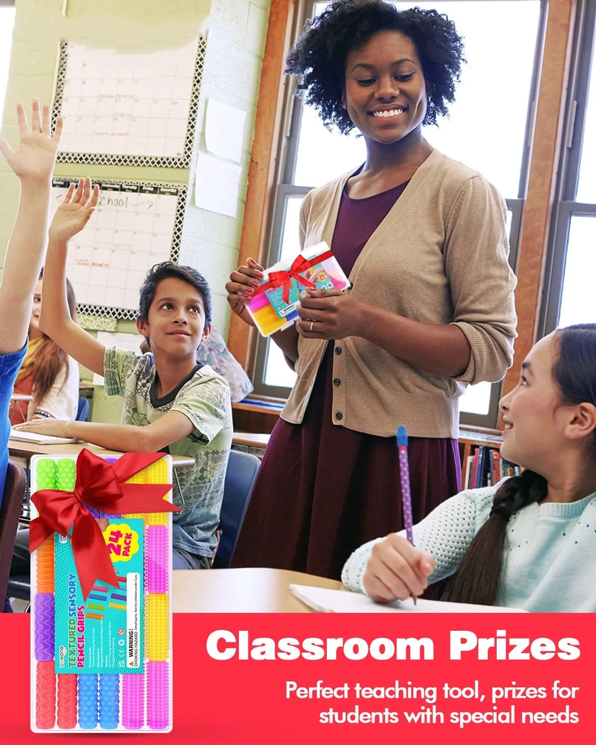 Perfekte Helferchen für Kinder mit ADHS oder Autismus! Diese 24 bunten Stifthalter aus weichem Silikon bieten sanfte sensorische Stimulation und helfen bei der Konzentration beim Schreiben. Jeder Griff hat eine eigene strukturierte Oberfläche in verschiedenen Farben, die die Sinne anregen und das Schreiben angenehmer machen.