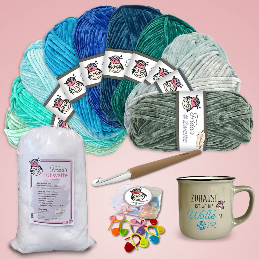 Was dich erwartet: • 24 Überraschungstütchen • Sockenwolle von Marken wie Opal, Lana Grossa • Genug Wolle für ca. 15 Paar Socken • Praktisches Strick-Zubehör • Vintage Frida-Spruchtasse