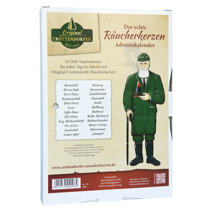 Dieser Räucherkerzen-Adventskalender macht die Vorweihnachtszeit noch schöner! Im praktischen Hochformat (21x30x3,2 cm) mit nem total niedlichen Motiv: Weihnachtsmann mit ner Lore voller Geschenke, musizierende Ziegenbeine und ne riesige Räucherkerze im Hintergrund. Hinter jedem der 24 Türchen verbirgt sich eine andere Original Crottendorfer Räucherkerze - also jeden Tag ein neuer Duft! Die Räucherkerzen sind in Größe M - also genau richtig. Perfekt für die ganze Familie um Tag für Tag mehr Weihnachtsstimmung aufkommen zu lassen. Macht sich super als Geschenk oder zum Selbstbehalten. Kombinier mit nem Räucherkerzenhalter für das volle Erlebnis! So macht Warten auf Weihnachten richtig Spaß - jeden Tag ein neues Dufterlebnis das an Weihnachten erinnert. Einfach Türchen öffnen, Räucherkerze anzünden und in Weihnachtsstimmung schwelgen!