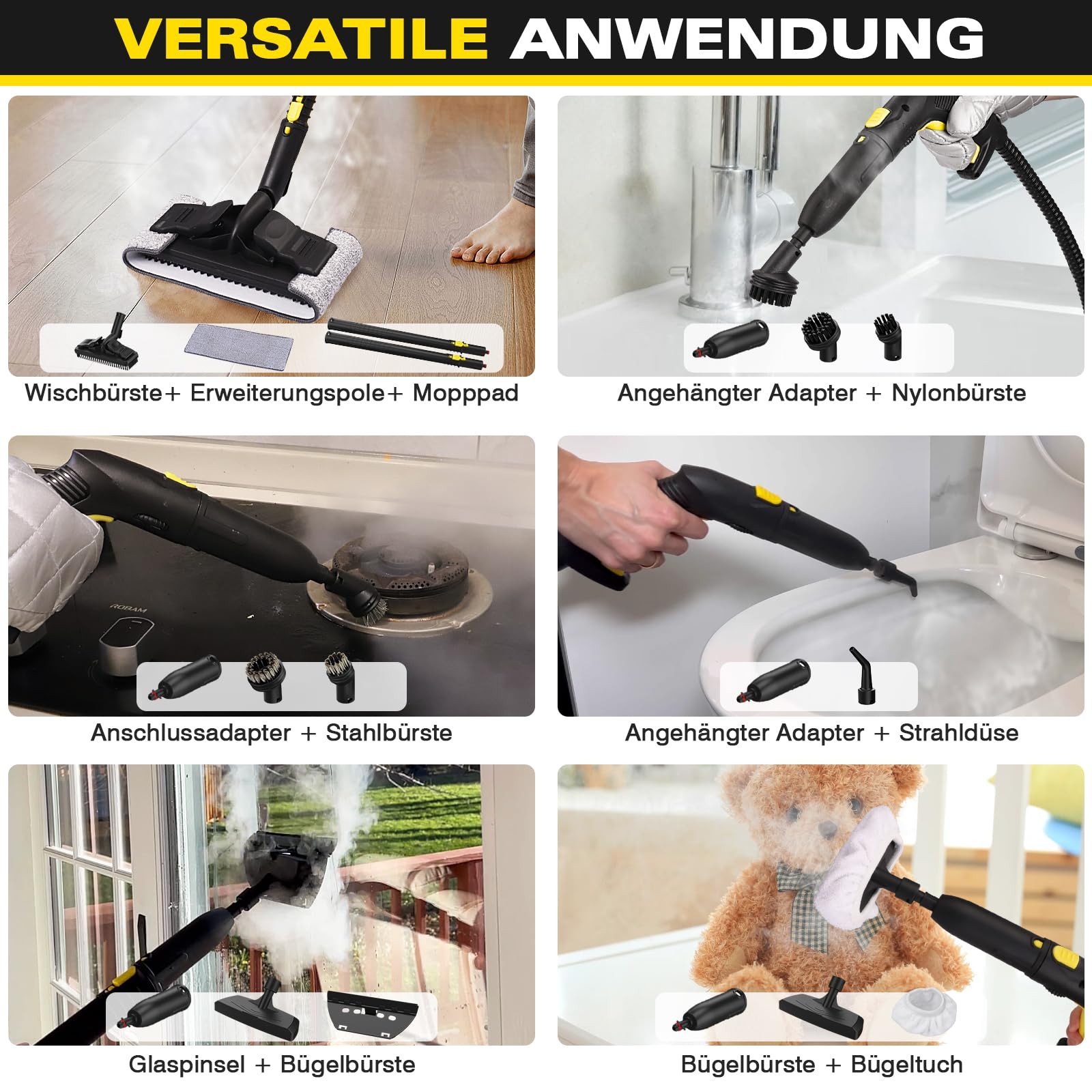 Der Waitbird Dampfreiniger revolutioniert deine Putzroutine! Mit fortschrittlicher Schnellheiztechnologie erreicht er in nur 5 Minuten heiße 248°F. Der große 1,1L Wassertank ermöglicht bis zu 45 Minuten ununterbrochene Reinigung. Mit 21 praktischen Zubehörteilen meistert er jede Herausforderung: Böden, Sofas, Fenster, Küche, Bad, Auto-Innenraum und mehr. Die Dampfmenge ist stufenlos von MIN bis MAX einstellbar. Besonderes Highlight: Der Schultergurt für ermüdungsfreies Tragen und der fahrbare Sockel für leichte Beweglichkeit. Perfekt für die chemiefreie Reinigung von Spielzeug, Polstern und empfindlichen Oberflächen. Einfache Bedienung mit automatischer Dampfsperre und klaren LED-Anzeigen. Dein Allround-Talent für ein hygienisch sauberes Zuhause - ganz ohne Chemiekeule!