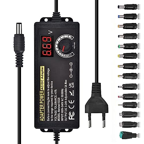 Tech-Fans, aufgepasst! Dieses Universal-Netzteil ist ein echter Allrounder: einstellbar von 3V bis 24V mit max. 5A und 120W Leistung. Das LED-Display zeigt die aktuelle Spannung an - super praktisch zur Kontrolle. Mit 14 verschiedenen Steckern dabei, darunter 5,5x2,5mm, Micro-USB, Type-C und mehr - passt also an fast jedes Gerät. WICHTIG: Nur für Geräte OHNE wiederaufladbare Batterien geeignet - also ideal für Router, LED-Streifen, 3D-Drucker, TV-Boxen, Kameras etc. Eingang: 100-240V AC, Ausgang: 3-24V DC einstellbar. Der Drehknopf ermöglicht präzise Spannungseinstellung, mit OFF-Position zum Abschalten. Mit Überspannungs-, Überstrom- und Überhitzungsschutz für sicheren Betrieb. Das 1,8m lange Kabel gibt genug Spielraum. Einfach ein vielseitiges Netzteil für Werkstatt, Hobby oder Haushalt - aber bitte die Anleitung beachten und nie an batteriebetriebene Geräte anschließen!
