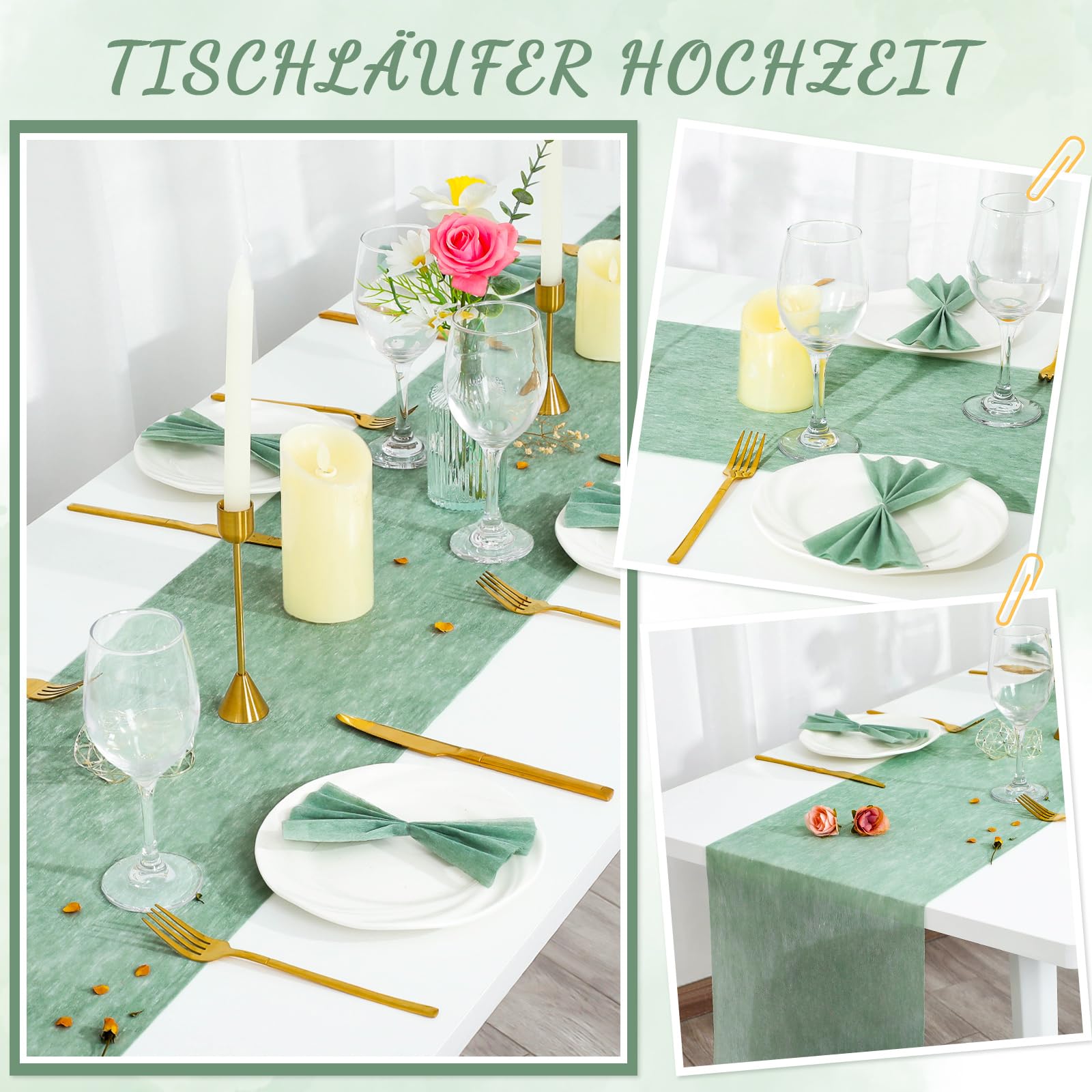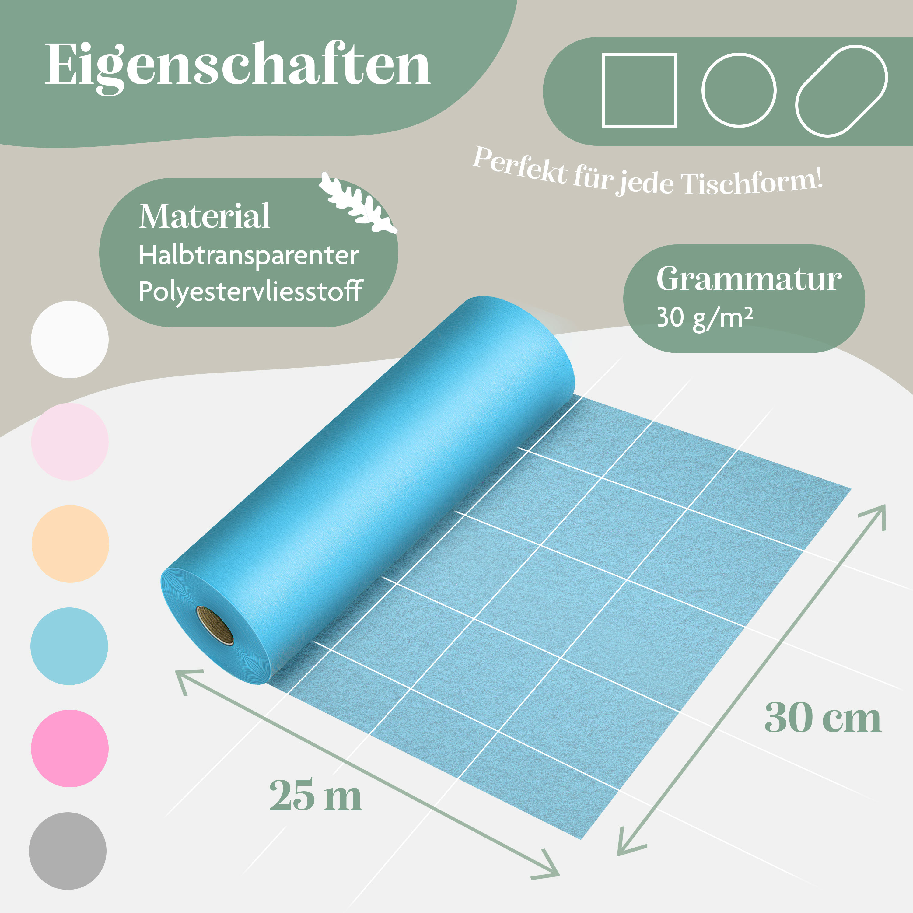 Planst du eine besondere Feier und suchst nach der perfekten Tischdekoration? Dieser aboveBED Vlies Tischläufer in schönem Eukalyptus-Grün ist genau das Richtige! Mit 25 Metern Länge und 30 cm Breite hast du genug Material für mehrere Tische - und sparst dabei im Vergleich zu einzelnen Läufern. Aus Polyestergewebe gefertigt, ist er knitterfrei und hat ein subtil durchscheinendes Design, das deinen Tischen dimensionale Eleganz verleiht. Perfekt für Taufen, Kommunionen, Hochzeiten, Geburtstage, Jugendweihen oder Firmenfeiern. Einfach mit Schere oder Maschinenschneider auf die gewünschte Länge zuschneiden. Wiederverwendbar bei leichten Flecken oder als praktische Einweg-Lösung. Leg ihn über Tischdecken für Farbakzente, kombiniere ihn mit Blumen oder Lichterketten - oder werde kreativ und verwandle ihn in Geschenkpapier oder Bastelmaterial. Dieser vielseitige Läufer verwandelt jeden Tisch von lässig bis formell und macht deine Feier zu etwas Besonderem!