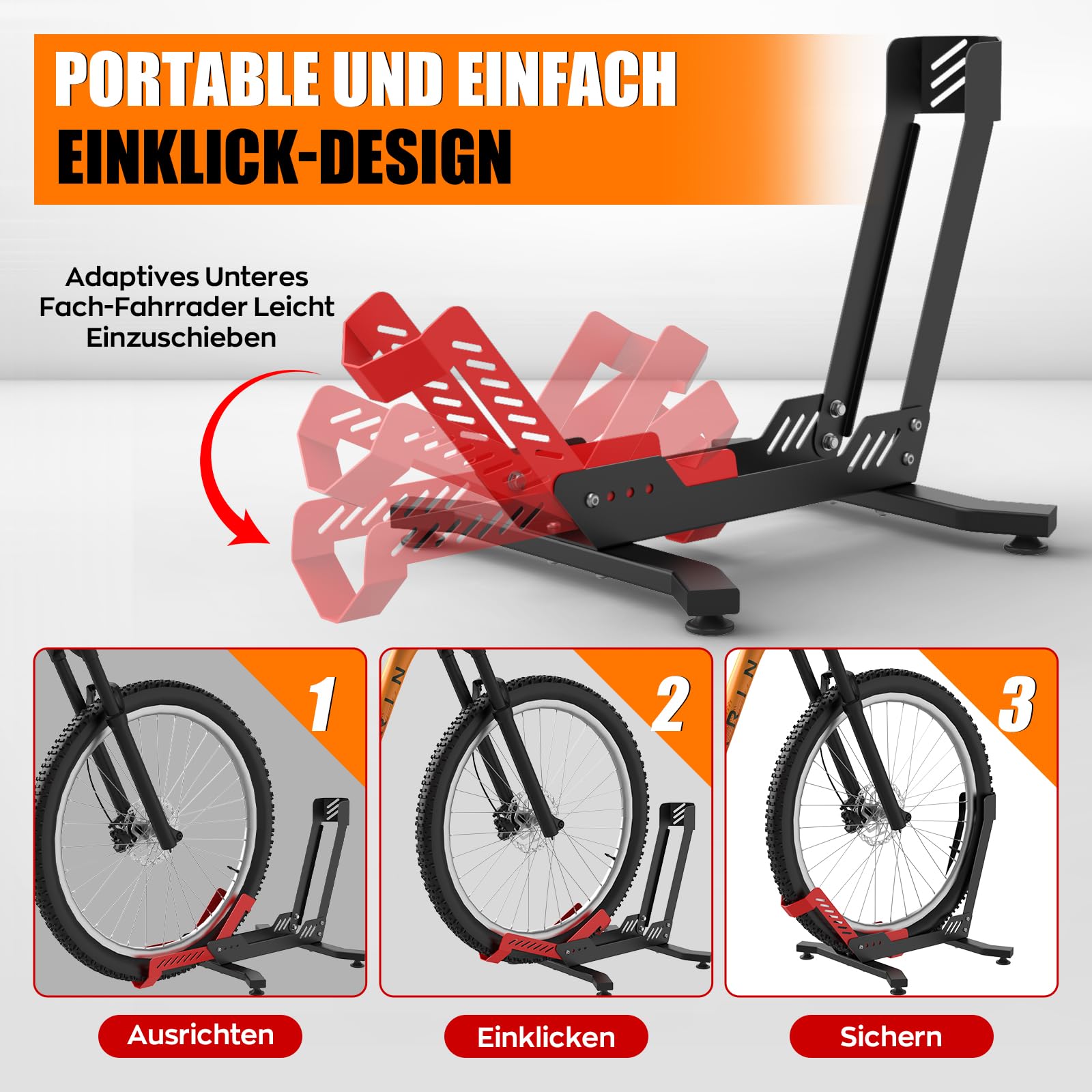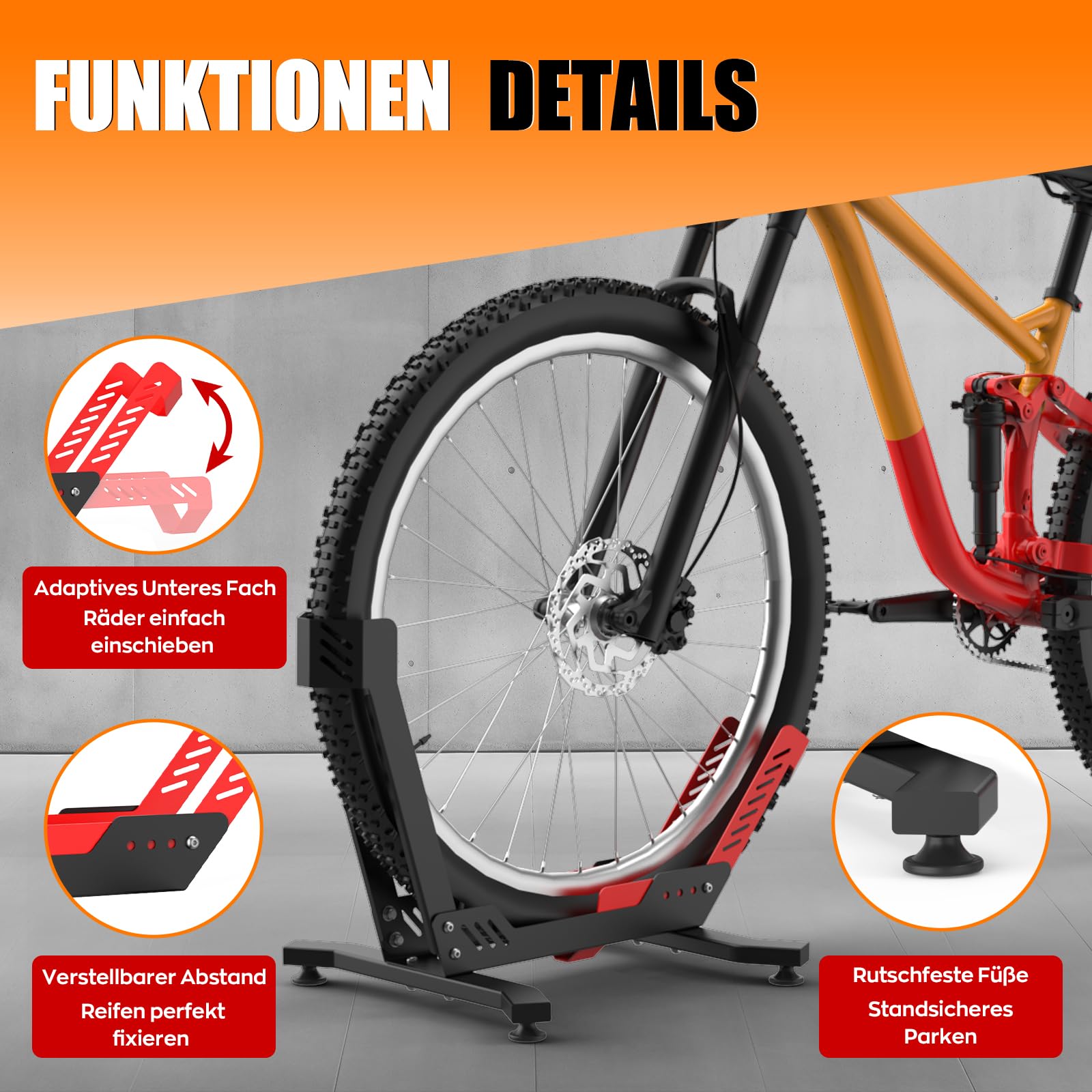 Endlich Schluss mit angelehnten Rädern! Dieser IMAYCC Fahrradständer ist einfach genial praktisch! Das mühelose Push-In-Design ermöglicht schnelles und einfaches Unterstellen deines Bikes. Kein mühsames Anheben wie bei wandmontierten Lösungen - das spart Zeit und Kraft! Und das Beste: Ohne Bohren oder Wandschäden! Say goodbye zum Anlehnen von Rädern an Wänden, Häusern oder Bäumen! Die Konstruktion ist absolut premium: Hochfester Stahl mit veredelter Beschichtung für verbesserten Rostschutz und Wetterbeständigkeit! Trägt auch schwere Bikes sicher ohne zu wackeln! Die vier rutschfesten Gummifüße halten den Ständer fest am Platz und bieten doppelten Schutz beim Parken! Kompatibel mit einer Vielzahl von Fahrradgrößen: 24-29 Zoll mit Reifenbreiten bis 3,0 Zoll! Egal ob Mountainbike, Rennrad, Hybrid-Bike oder E-Bike - alles passt! Keine voreingestellten Positionen nötig - einfach flexibel unterstellen! Perfekt für Garage, Innen- und Außenbereiche, Fahrradgeschäfte und mehr! Du hast endlich eine sichere und stabile Aufbewahrungslösung! Und das erleichtert auch Reinigungs- und Wartungsarbeiten wie Reifenaufpumpen, Abwischen oder Reparaturen! Einfach super praktisch! Bei Fragen stehen wir dir vor und nach dem Kauf zur Verfügung! Kostenloser Umtausch oder Rückerstattung möglich - damit dein Einkaufserlebnis einfach reibungslos verläuft! Einfach ein Must-Have für jeden Fahrradbesitzer!