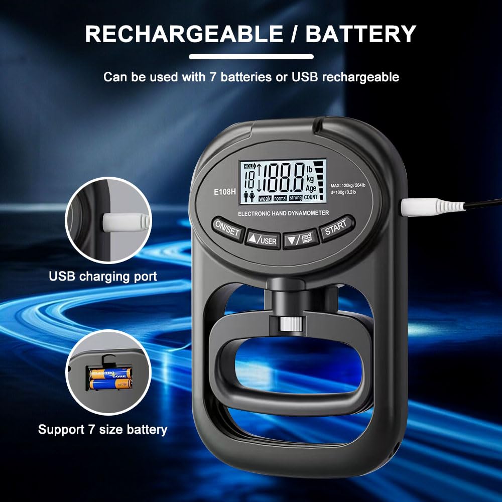 Wow, dieses Hand Dynamometer ist richtig professionell! Misst deine Griffkraft bis zu 265 Pfund (120kg) - und das super genau mit 0,2lbs Schritten. Das LCD Display zeigt alles an: Benutzercode, Alter, Geschlecht und deinen Griffstatus. Kann bis zu 19 Messwerte speichern, perfekt um deine Fortschritte zu tracken. Aufladbar per USB oder mit AAA Batterien - total praktisch! Ob für Physiotherapie, Sporttraining oder einfach um fit zu bleiben - damit checkst du deine Handkraft wie ein Profi. Die automatische Vergleichsfunktion zeigt dir sofort, ob du besser oder schlechter warst als beim letzten Mal. Einfach in die Hand nehmen, zudrücken und schon siehst du deine Werte! Ideal für Kraftsportler, Kletterer oder jeden, der seine Handkraft verbessern will.