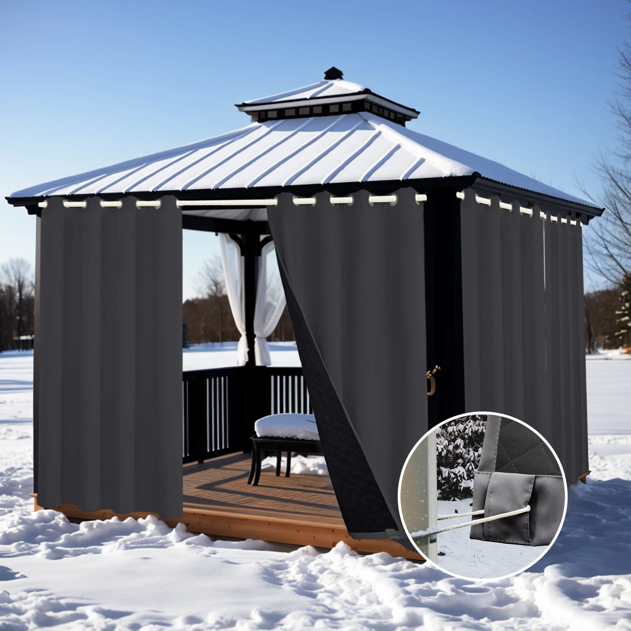 Mach deine Terrasse zur Ganzjahres-Wohlfühloase! Diese Thermovorhänge aus doppellagigem Polyester (405g/m²) halten im Winter die Kälte draußen und im Sommer die Hitze. Komplett wasserdicht und mit UV-Schutz - perfekt für Balkon, Terrasse oder Garten. Mit Ösen, Stangentasche und Klettbändern für flexible Befestigung. Die dunklen Farben bieten 100% Verdunkelung und Schalldämmung. Inklusive gratis Raffhalter für stylisches Arrangieren!