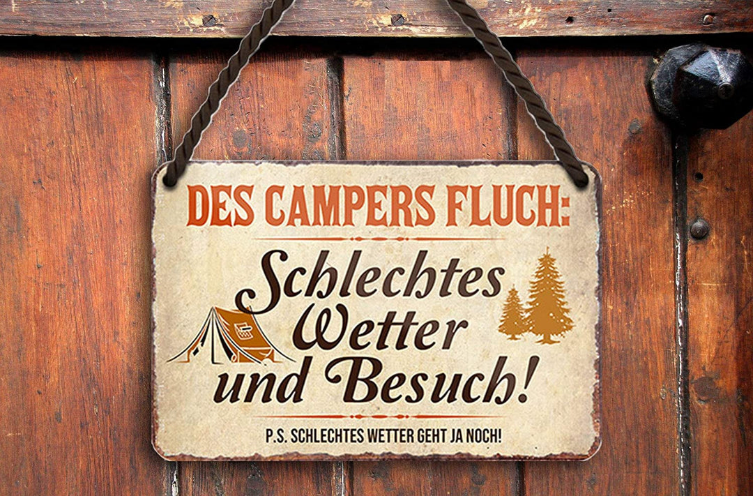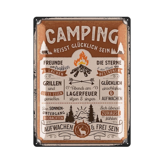 Total witzige Blechschilder für Camper und Wohnmobil-Fans! Im 2er-Set mit lustigen Camping-Sprüchen. Jedes Schild ist 30x20cm groß, aus robustem Edelstahl. Die Ecken sind abgerundet, sieht richtig vintage aus! Wetterfest - kann also auch draußen am Wohnwagen hängen. Macht sich super in der Garage, im Garten oder natürlich im Campingbus. Perfekt als Geschenk für Camper-Freunde, zum Geburtstag oder einfach so. Die retro Optik kommt immer gut an! Einfach aufhängen und schon hat man nen echten Hingucker. Qualität ist top, verblasst nicht in der Sonne. Echt ne coole Deko für alle, die Camping lieben! Bringt immer ein Schmunzeln ins Gesicht.