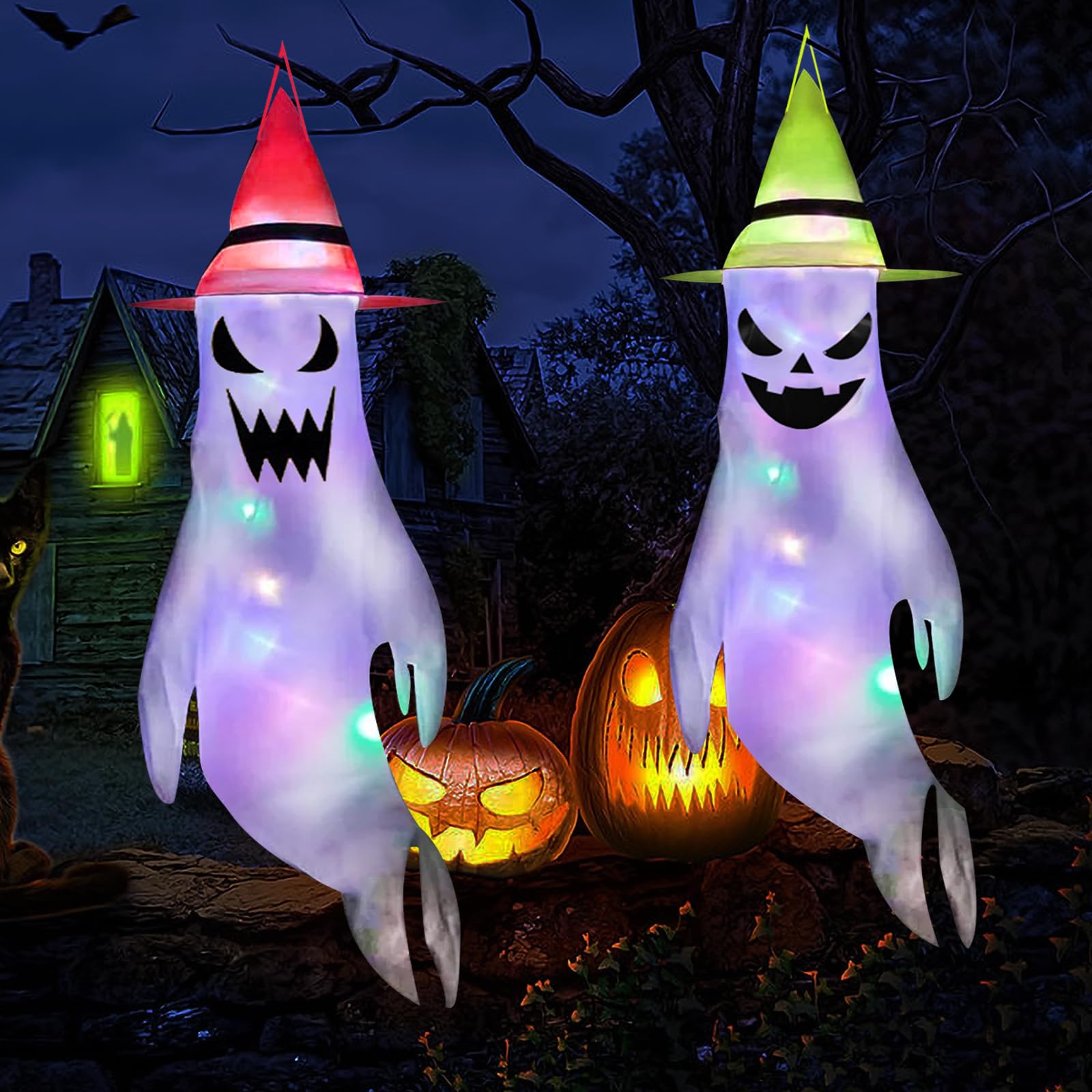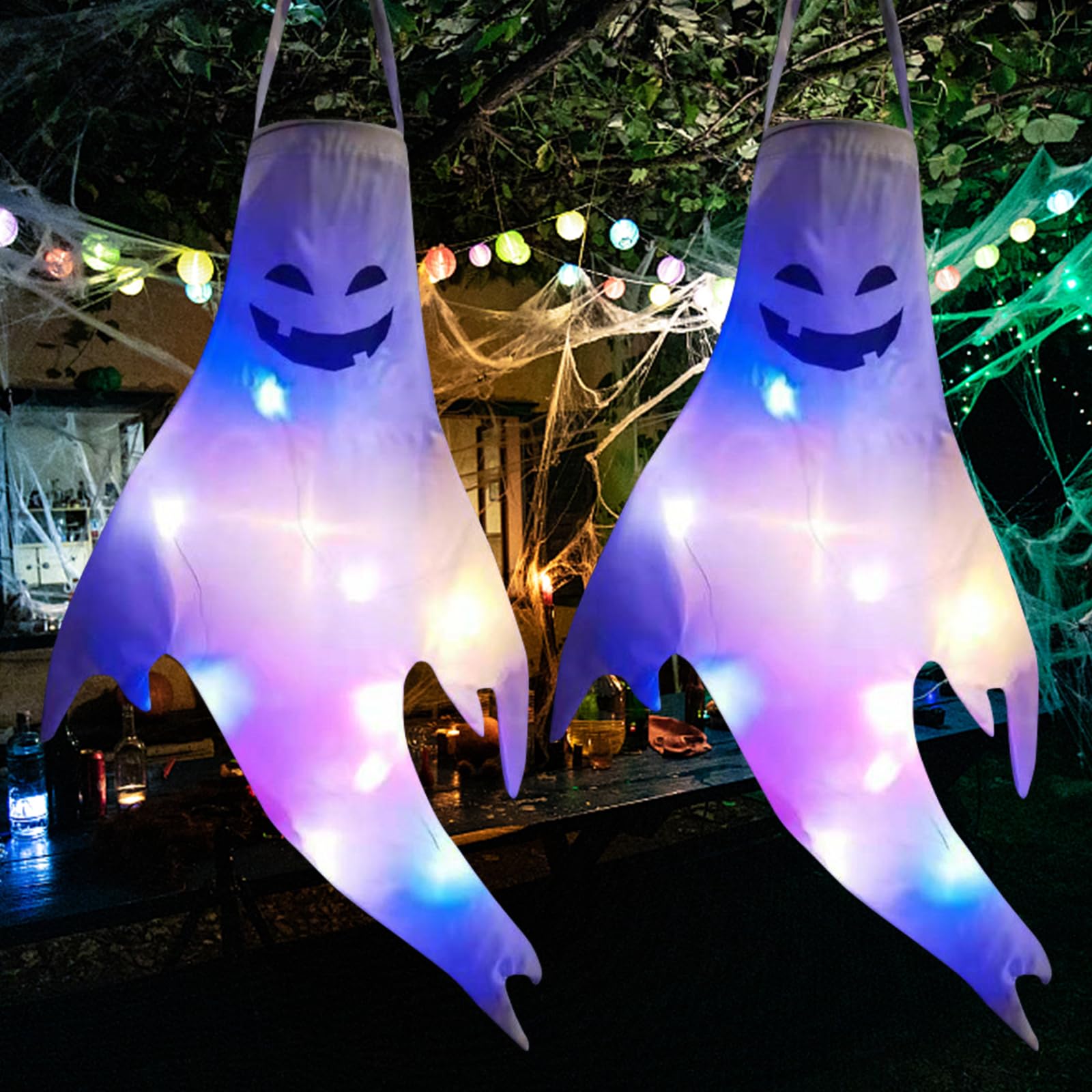 Halloween steht vor der Tür? Dann hol dir diese coolen Geister-Windsäcke! Im Set sind zwei Stück dabei, jeweils 120 cm hoch, plus zwei bunte LED-Lichter. Die Dinger sehen nicht nur gruselig aus, wenn sie im Wind flattern, sondern leuchten auch noch im Dunkeln. Einfach im Garten, auf der Terrasse oder am Fenster aufhängen - und sofort ist Gruselstimmung angesagt. Aus robustem Polyester halten sie auch mal was aus. Die Maße können minimal abweichen, aber das macht den Spaß ja nicht kleiner. Perfekt für die Party-Deko oder um einfach nur die Nachbarn zu erschrecken!
