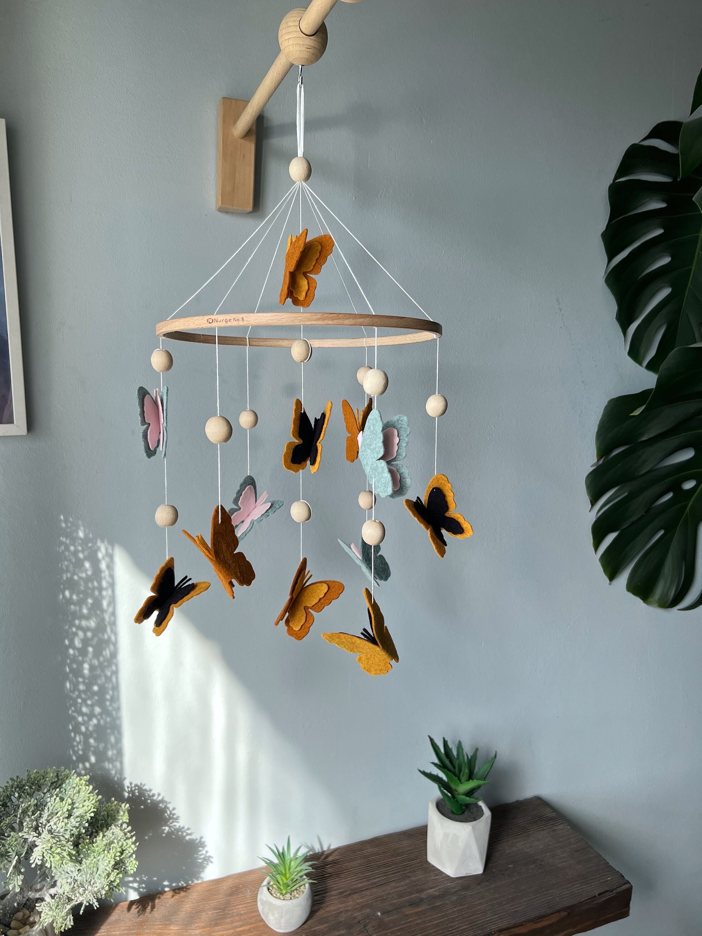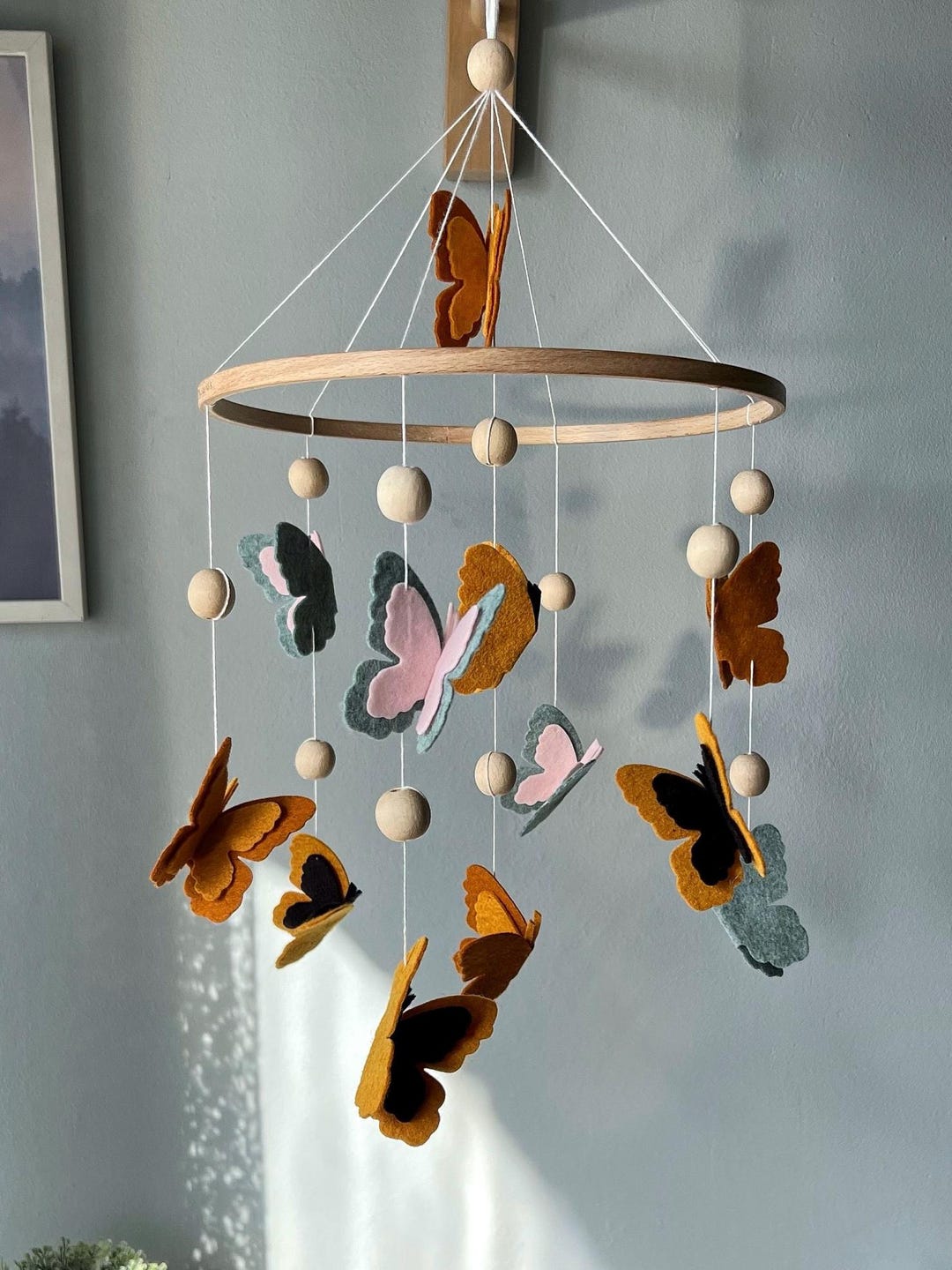 Wie süß sind denn diese handgemachten Schmetterling-Mobiles? Perfekt fürs Babyzimmer, aber auch total hübsch im Wohnzimmer oder Schlafzimmer! Du bekommst 2 Stück - jeweils etwa 60x15x15 cm groß. Die Mobiles bestehen aus weichem Filzplüsch mit flauschigen Haarbällen und sehen einfach bezaubernd aus. Aufhängen ist total einfach - du kannst sie flexibel platzieren wo du willst. Weil sie so leicht sind, kannst du sie auch problemlos umhängen oder verstauen. Die Qualität ist super, jedes Mobile ist mit Liebe handgefertigt. Ob über dem Babybett, als Raumdekoration oder als besonderer Hingucker - diese Schmetterlinge bringen sofort gute Laune ins Zimmer! Die Farben sind fröhlich und verspielt, aber trotzdem dezent genug für jede Einrichtung. Einfach aufhängen und sich an dem charmanten Design erfreuen. Perfekt als Geschenk zur Geburt oder einfach um das Kinderzimmer gemütlicher zu machen!