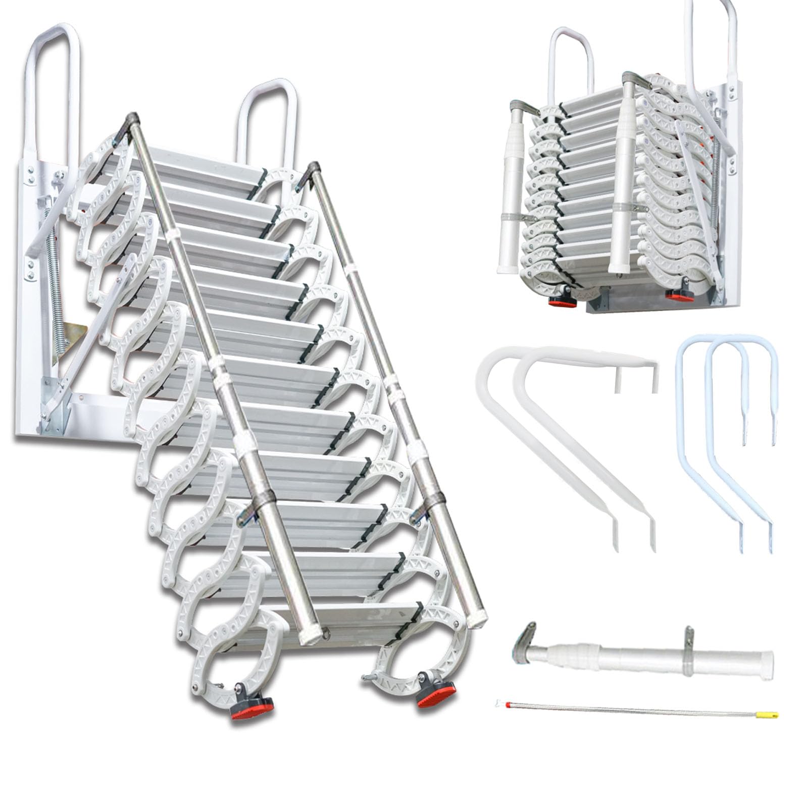 Wow, diese EXCLURA Dachbodentreppe ist ja mal richtig praktisch! Stell dir vor: Eine klappbare Aluminiumleiter, die sich super platzsparend verstauen lässt. Mit 10,5 Fuß (das sind etwa 3,2 Meter) und 11 Stufen ist sie perfekt für Decken von 3 bis 4 Meter Höhe. Die Trittstufen sind 18 cm tief und rutschfest - da hast du sicheren Halt beim Hochklettern. Das Tolle: Sie trägt bis zu 150 kg und ist aus robuster Aluminiumlegierung, die sich nicht so schnell verbiegt. Der Haken ist verstellbar, also passt sich der Winkel deinen Bedürfnissen an. Ob für den Dachboden, die Garage, den Schuppen oder als Notleiter - dieses Teil ist ein echter Allrounder! Die Montage ist total einfach, das Zubehör liegt schon bei. Und wenn du sie nicht brauchst, klappst du sie einfach zusammen und verstaut sie platzsparend. Perfekt auch für Tiny Homes oder kleine Räume, wo jeder Zentimeter zählt!
