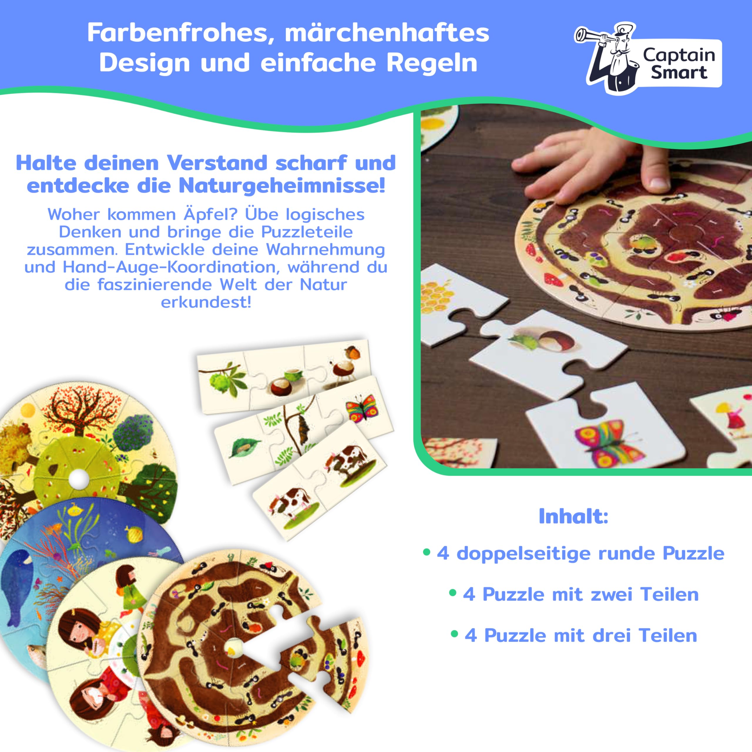 Lernen mit Spaß! Das Captain Smart Lernspiel ist perfekt für neugierige Kinder von 3 bis 7 Jahren. Mit bunten Puzzles entdecken sie die Natur und trainieren dabei ihr logisches Denken. Ob Ähnlichkeiten finden, Gegensätze erkennen oder Zusammenhänge verstehen - hier wird's nie langweilig! Fördert die Wahrnehmung, Auge-Hand-Koordination und sogar das Zählen bis 10. Mehrfach ausgezeichnet und von Experten empfohlen. Super für allein oder mit Freunden zu spielen. Das ideale Geschenk für Kindergartenkinder oder Schulanfänger. Mach deinem Kind eine Freude und unterstütze seine Entwicklung spielerisch!