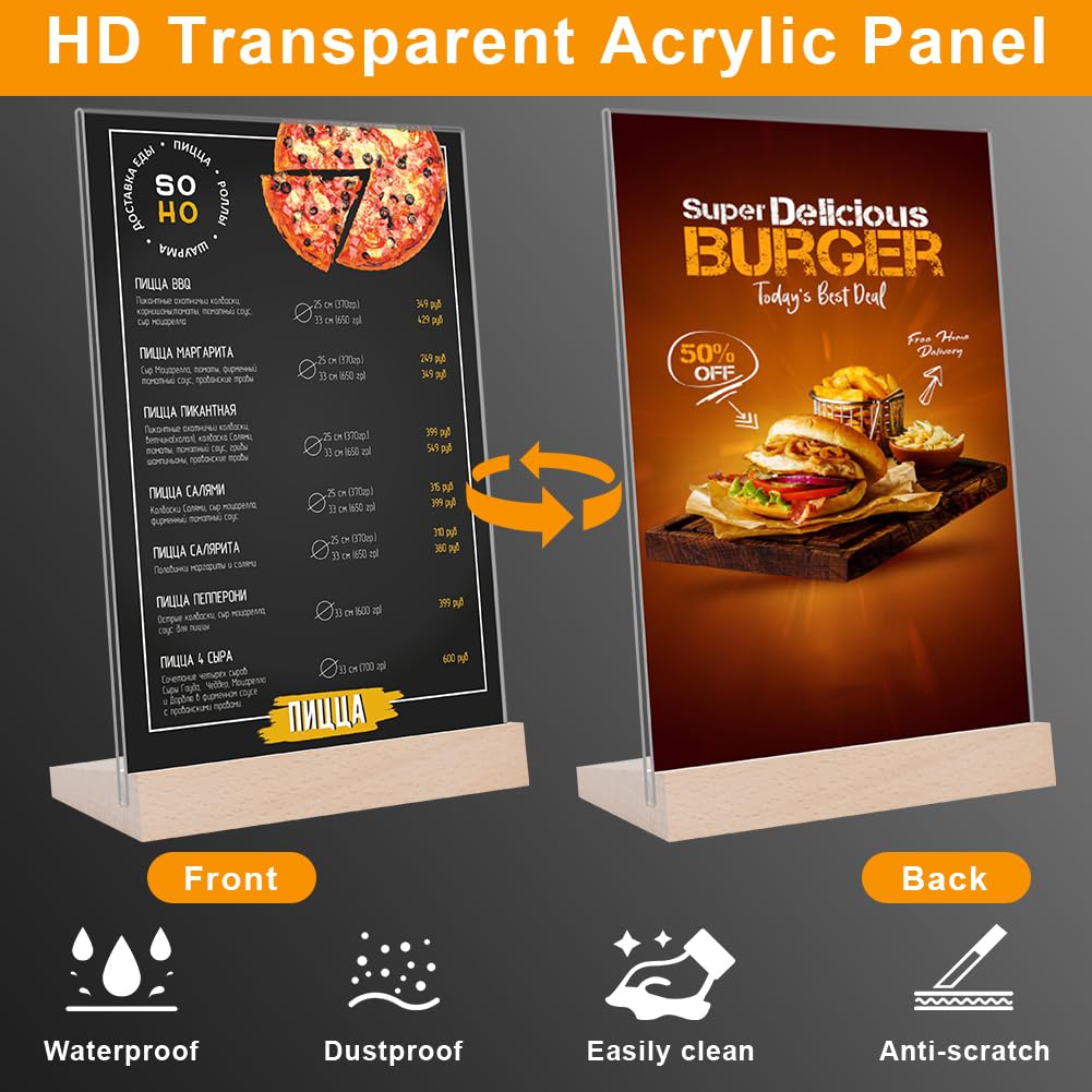 Hey, diese Acryl-Aufsteller sind ja mega praktisch! Bekommst gleich 3 Stück - perfekt für Restaurant, Café oder Büro.\n\nJeder Ständer ist für A5-Größe (15x21 cm) und hat einen stabilen Holzfuß aus Buchenholz. Sieht nicht nur gut aus, sondern steht auch sicher!\n\nAus 3 mm starkem Acryl - kristallklar und robust. Die Kanten sind schön glatt geschliffen, nichts scharfes.\n\nDoppelseitig nutzbar - deine Gäste können von beiden Seiten lesen was draufsteht. Und das Acryl schützt die Inhalte vor Flecken und Knittern.\n\nAufbau? Voll einfach! Schutzfolie abziehen, Blatt reinlegen, fertig. In 10 Sekunden einsatzbereit.\n\nOb für Speisekarten, Werbung, Preisschilder, Fotos oder Aushänge - damit wird alles professionell präsentiert. Und wenn sich was ändert, einfach das Blatt tauschen!