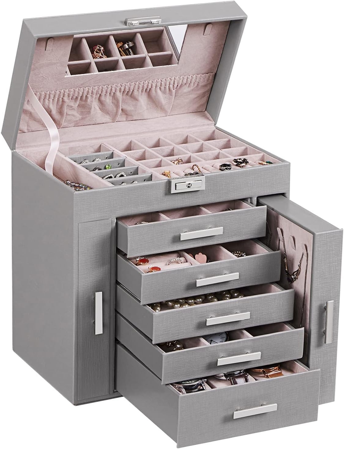 Endlich Ordnung im Schmuckchaos! Dieses richtig praktische Schmuckkästchen von SONGMICS hat gleich drei Ebenen, wo du all deine Schätze sicher verwahren kannst. Mit Maßen von 17,5 x 13,5 x 12 cm ist es kompakt genug für die Kommode, aber geräumig genug für deine gesamte Schmucksammlung. Das coole Feature: Ein integrierter Spiegel im Deckel, damit du gleich checken kannst, wie die Ohrringe oder die Halskette an dir aussehen. Aus hochwertigem Kunstleder in schickem Schiefergrau gefertigt, mit weichem Samtfutter innen - so bleibt dein Schmuck sicher vor Kratzern. Und wenn du mal unterwegs bist: Einfach den Tragegriff packen und mitnehmen! Das Schloss mit zwei Schlüsseln sorgt dafür, dass neugierige Hände nicht drankommen. Perfekt für die Reise oder einfach als stylische Aufbewahrung daheim. Ob als Geschenk für die beste Freundin oder für dich selbst - dieses Schmuckkästchen macht einfach alles richtig! Die verschiedenen Fächer und Haken an den Seiten bieten Platz für Ringe, Ohrringe, Ketten und Armbänder. So findest du immer genau das, was du suchst, und hast alles schön sortiert. Ein echter Hingucker für dein Zimmer und ein super Organizer für deine Schätze!