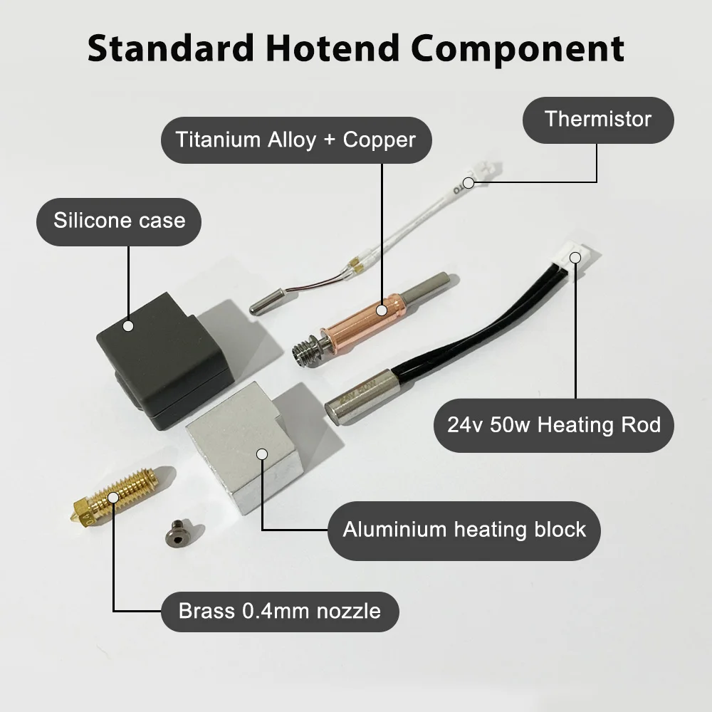 Bring deinen Anycubic Kobra 3 wieder auf Hochtouren! Dieses 2er-Set Hot End Kits ist speziell für den Kobra 3 entwickelt und garantiert perfekte Kompatibilität. Aus Chromkupfer und Titanlegierung gefertigt für maximale Haltbarkeit und präzise Temperaturkontrolle. Die 0,4mm Düse unterstützt Hochtemperatur-Materialien wie PLA, ABS, PETG und sogar TPU. Besonders praktisch für High-Speed-Druck - die speziell designeden Düsen optimieren den Materialfluss. Vor der Installation einfach alle Komponenten auf festen Sitz prüfen und das Hot Bed justieren für beste Ergebnisse. Keine aufwändige Nachjustierung nötig - einfach austauschen und losdrucken! Mit der Silikonhülle bleibt die Temperatur konstant und gleichmäßig. Perfekt als Ersatzteil für verschlissene Hotends oder als Backup für lange Druckprojekte. Qualität, auf die du dich verlassen kannst - bei Fragen steht unser Kundenservice bereit. Hol dir jetzt dieses praktische 2er-Set und sei für jeden Druck vorbereitet!