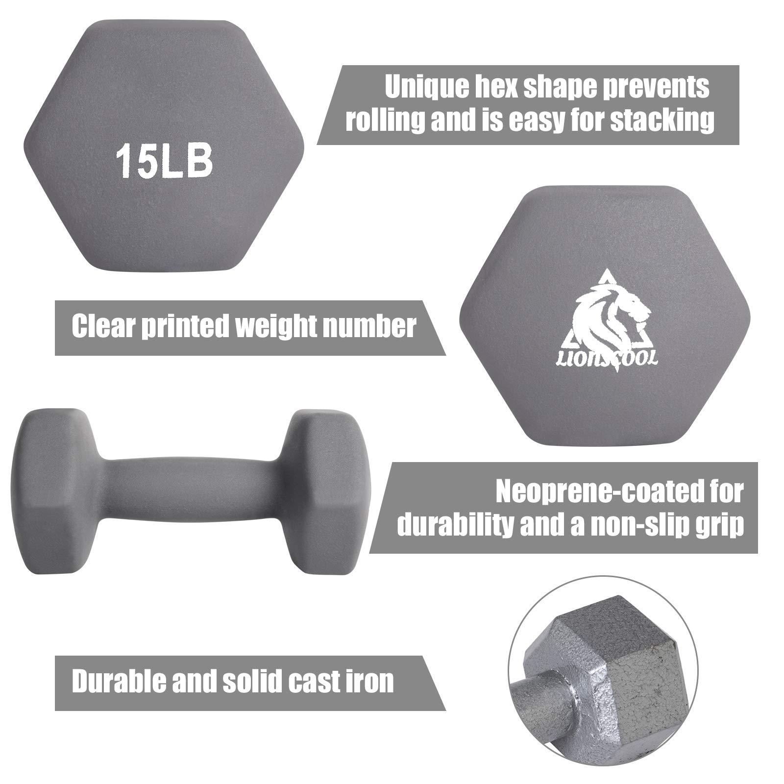 Perfekt für dein Home-Workout! Dieses coole Hantel-Set von LIONSCOOL bringt das Fitnessstudio zu dir nach Hause. Enthalten sind drei Paar Hanteln in den Gewichten 1kg, 2kg und 3kg - ideal für Einsteiger und Fortgeschrittene. Die sechseckigen Hantelköpfe verhindern lästiges Wegrollen und die weiche Neopren-Beschichtung sorgt für einen sicheren, angenehmen Griff.