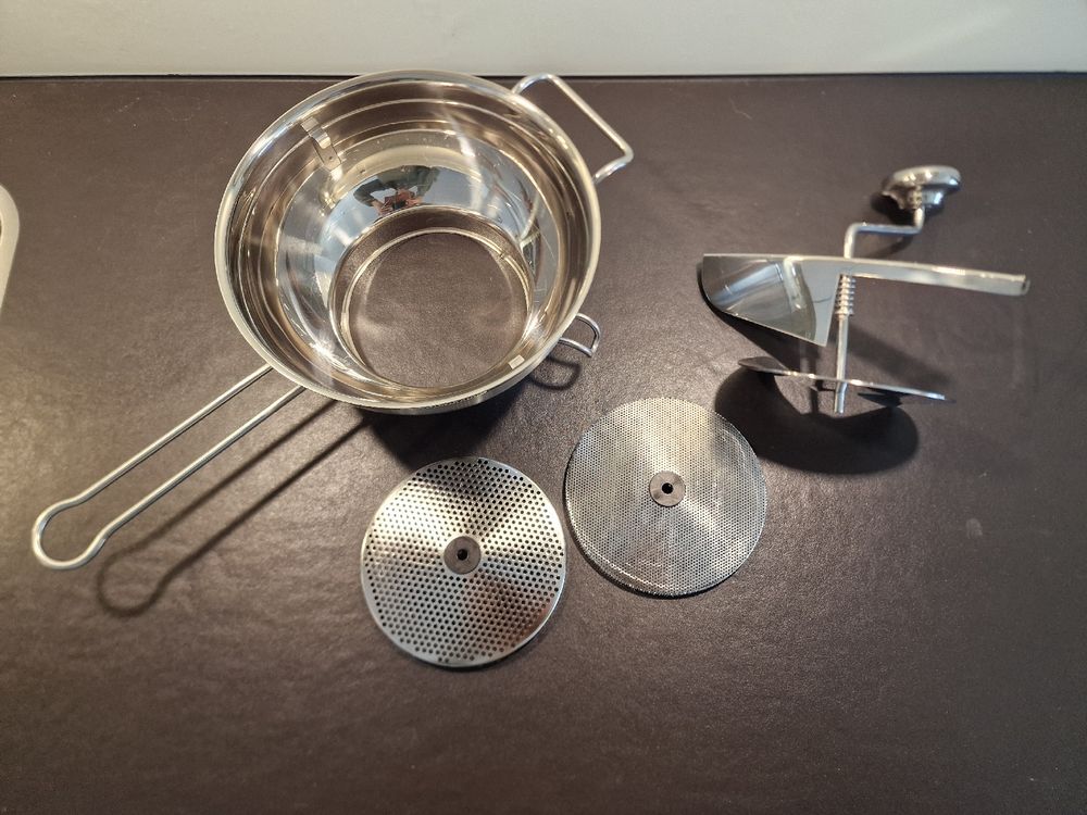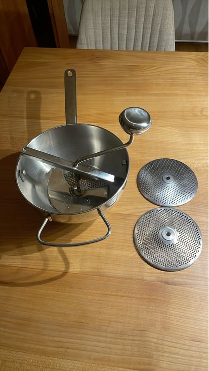 Endlich ne ordentliche Passiermühle die was aushält! Komplett aus lebensmittelechtem Edelstahl - da rostet nix und die Reinigung in der Spülmaschine ist kein Problem. Mit drei austauschbaren Sieben kriegst du jede Konsistenz hin: feinster Brei für Babynahrung, glattes Püree für Suppen oder etwas gröber für Marmeladen. Die doppelten Griffe sind hitzebeständig - super wichtig wenn du mit heißen Tomaten oder Äpfeln arbeitest. Und der federunterstützte Drehknopf macht das Passieren super leicht - keine Anstrengung mehr für die Hände! Bei 38x19x8cm und 550g Gewicht liegt sie gut in der Hand. Ob für Tomatensoße, Apfelmus, Kartoffelpüree oder Gelee - damit wird jedes Püree perfekt. Einfach zusammenbauen, Gemüse oder Obst rein und drehen. Seit Jahren das Geheimnis von Profiköchen - jetzt auch für deine Küche!