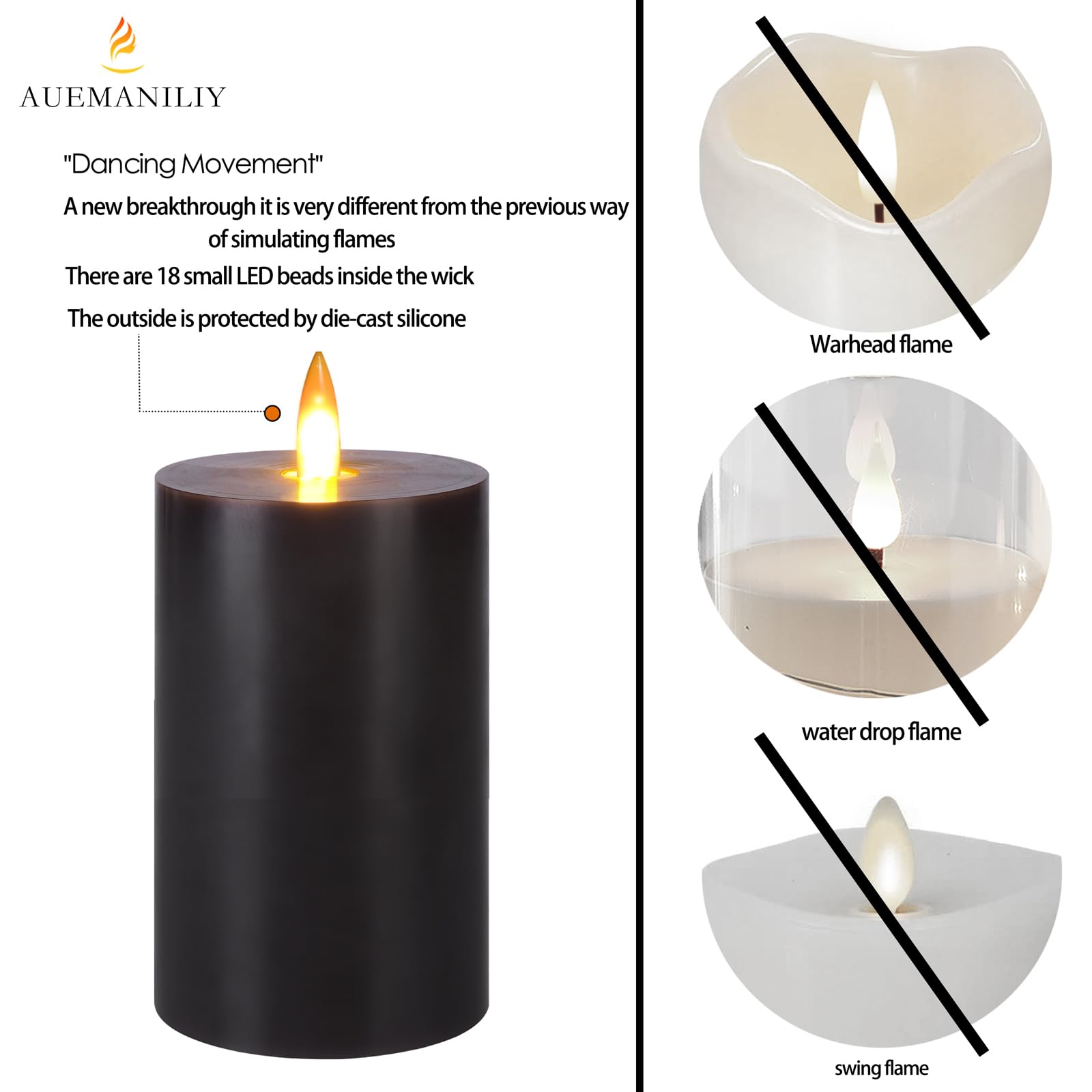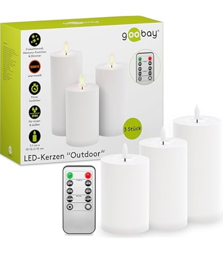 Gemütliche Atmosphäre ohne Risiko! Diese 3 Auemaniliy LED-Kerzen simulieren echte Flammen so realistisch wie nie zuvor. Mit Fernbedienung steuerbar und praktischem Timer (2/4/6/8 Stunden) - sie schalten sich automatisch ein und aus. Aus 100% reinem Paraffinwachs handgegossen, aber komplett sicher: Keine Rußentwicklung, keine Brandgefahr, perfekt für Haushalte mit Kindern und Haustieren. Die warmweiße Beleuchtung mit gelber Flamme schafft eine romantische Stimmung. Betrieben mit 2 AA-Batterien (nicht im Lieferumfang) für über 180 Stunden Laufzeit. Perfekt für Esstische, Feiern, Weihnachten oder einfach für gemütliche Abende. Verschiedene Höhen (10/13/15cm) sorgen für abwechslungsreiche Arrangements. Genieße Kerzenlicht ohne die Nachteile - Sicherheit und Gemütlichkeit in einem!