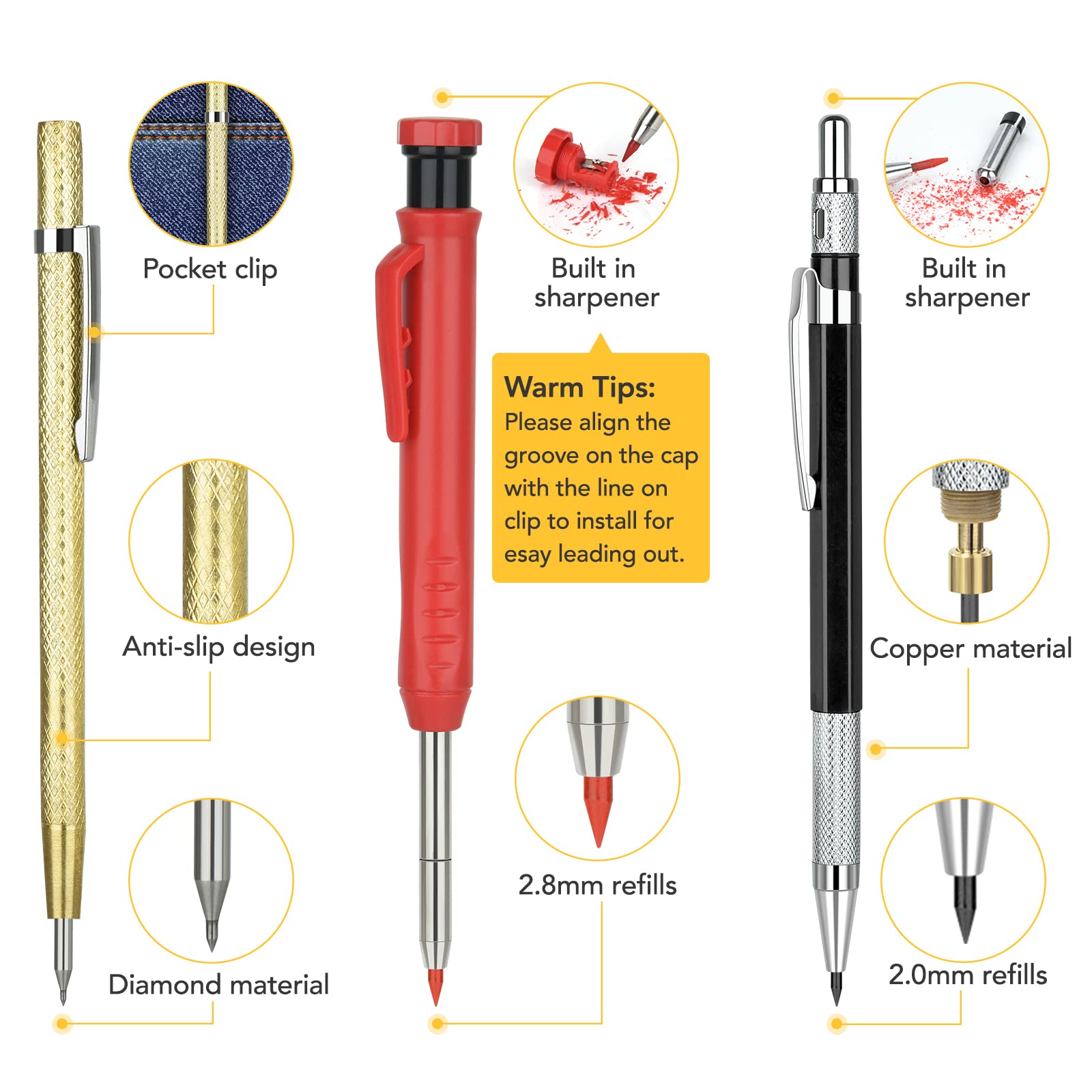 Das komplette Set für präzise Markierungen auf der Baustelle! Enthält 3 Zimmermannsbleistifte mit 39 Minen (2,8 mm) in 6 Farben, 3 Tieflochmarker mit langer Spitze, Spitzer, 4B-Radiergummi und Aufbewahrungsbox. Die 45 mm langen Spitzen der Tieflochmarker erreichen auch tiefe oder enge Löcher - perfekt für Elektriker, Klempner und Heimwerker. Die Minen sind bruchfest und markieren auf rauen, glatten, trockenen und nassen Oberflächen. Wasserfest, schnelltrocknend und wischfest für dauerhafte Markierungen. Ergonomische, rutschfeste Griffe und praktischer Taschenclip für einfachen Transport. Der integrierte Spitzer sorgt für immer scharfe Minen. Ob auf Holz, Metall, Kunststoff oder Beton - dieses Set liefert präzise Ergebnisse bei jeder Arbeit. Robustes Design für harte Arbeitsbedingungen, ideal für Profis und ambitionierte Hobby-Handwerker. Mit dieser Ausstattung wird jede Markierungsarbeit zum Kinderspiel!