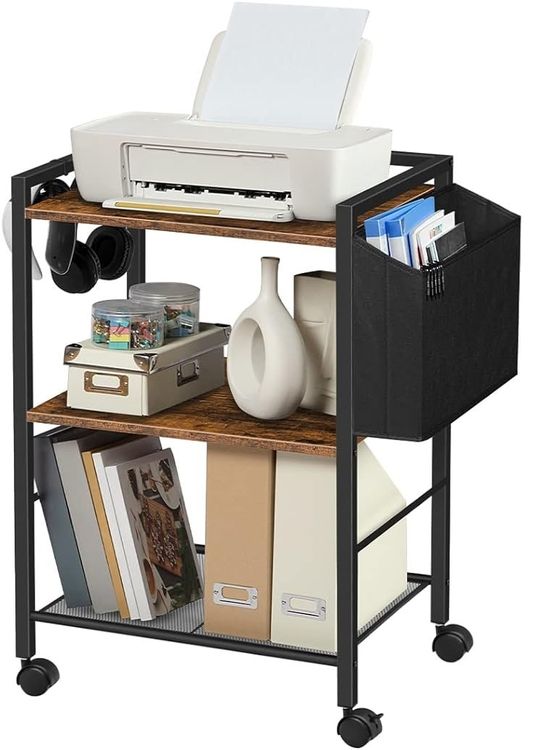 Endlich Ordnung für deinen Drucker und Bürozeug! Dieser praktische Druckerständer von HOMCOM hat drei Etagen und ist total mobil dank 4 Rollen (2 mit Bremse). Mit 50x50x53 cm passt er perfekt in jedes Büro oder Homeoffice. Der Stahlrahmen und die Spanplatten-Regale sind robust und halten bis zu 18 kg Gesamtlast. Oben trägt er 8 kg - ideal für deinen Drucker. Die klaren Linien sehen schick aus und passen zu jedem Einrichtungsstil. Einfach alles draufstellen und bei Bedarf leicht woanders hinschieben - super praktisch!