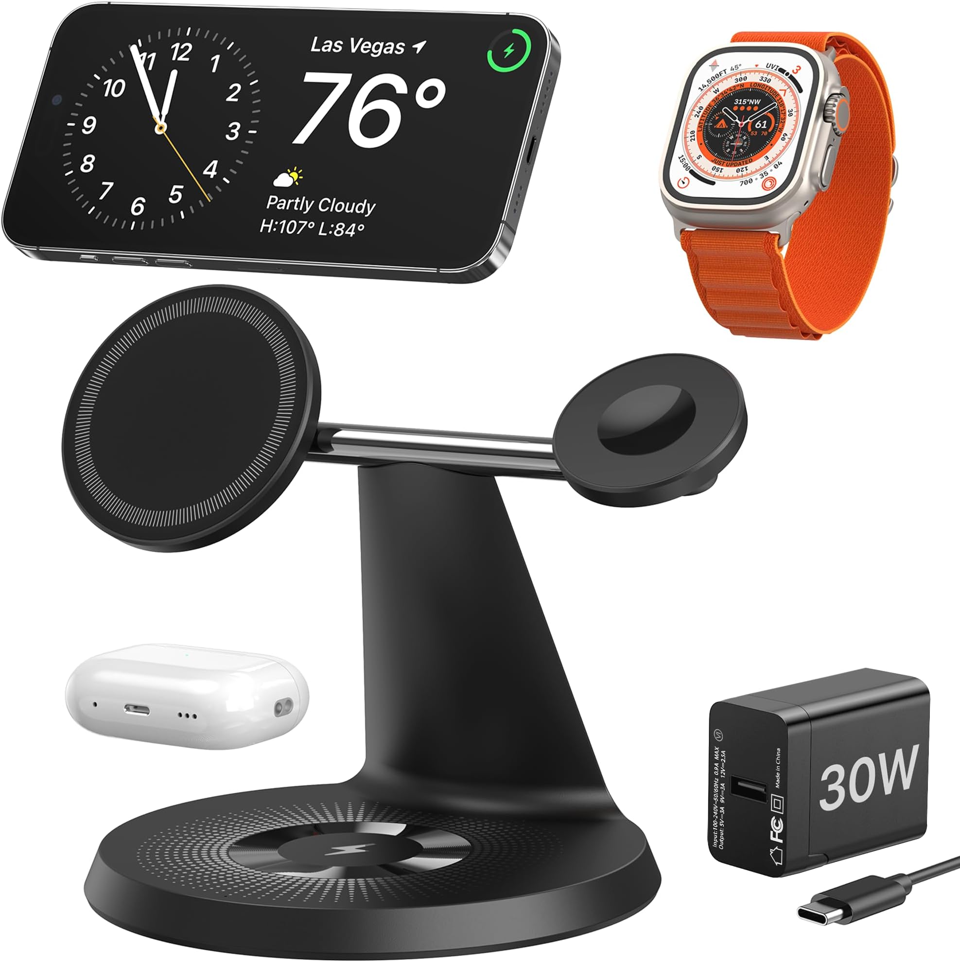 Schluss mit Kabelchaos! Diese elegante 3-in-1 Ladestation lädt dein iPhone, deine Apple Watch und deine AirPods gleichzeitig - und das mit satten 15W Schnellladung. Das MagSafe Design hält dein iPhone sicher fest, ob du es jetzt hochkant oder quer hinstellst.\\n\\nMit intelligentem Schutz vor Überhitzung, Überspannung und Überstrom laden deine teuren Apple Geräte absolut sicher. Das dezente Schlaflicht kannst du per Touch ausschalten, wenn es dich stört - perfekt fürs Nachtitsch.\\n\\nDie rutschfeste Auflage für die AirPods sorgt dafür, dass nichts verrutscht. Alles in einem schicken, kompakten Design das in jedes Wohnambiente passt. Im Lieferumfang ist alles dabei, was du brauchst: Ladestation, Kabel und Bedienungsanleitung. Endlich Ordnung auf deinem Nachttisch!