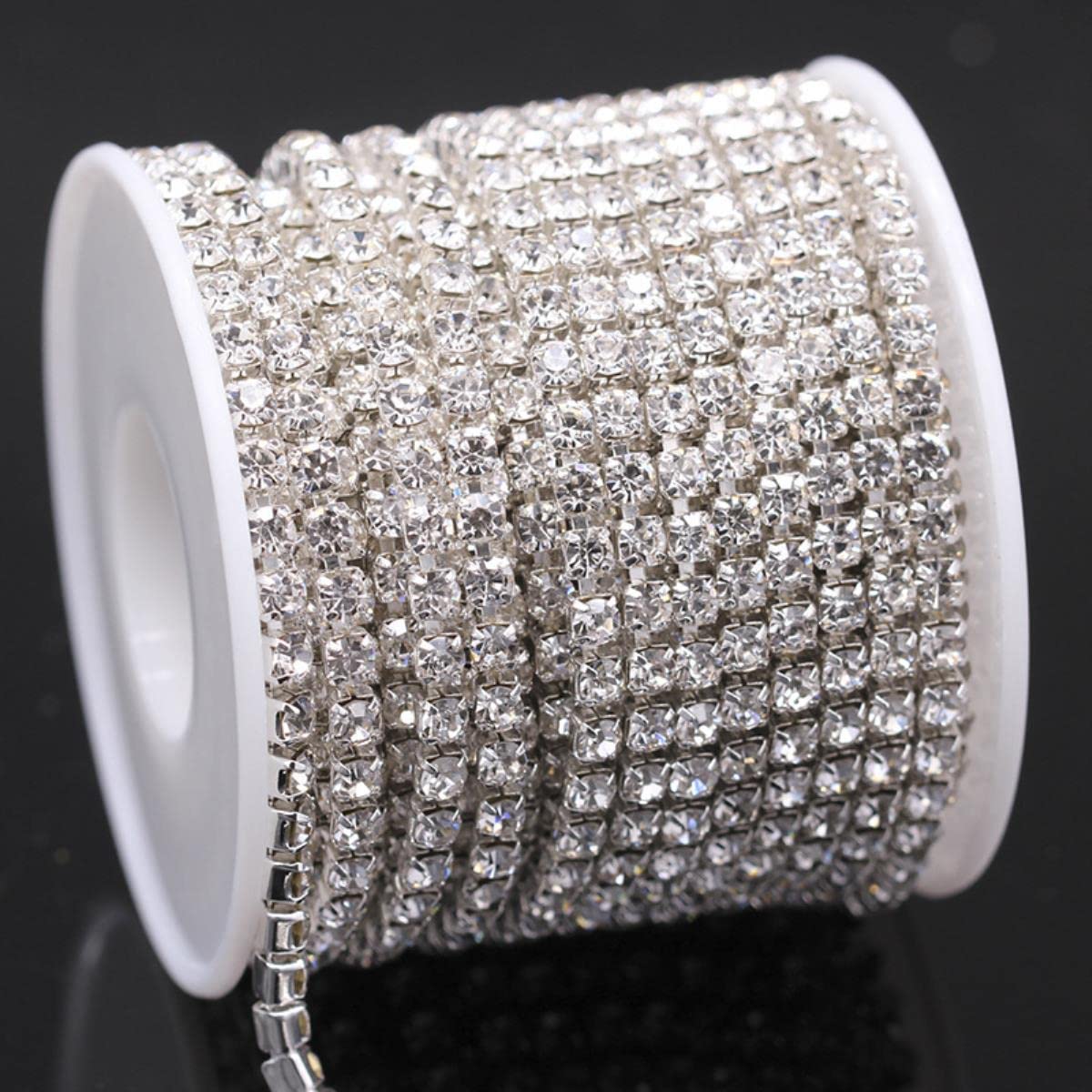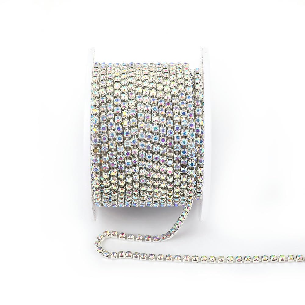 Glitzern und Glamour für deine Kleidung! Diese 3-reihige Strasskette in Gold/AB Bunt bringt jeden Look zum Strahlen. Perfekt zum Aufnähen auf Tops, Hüte, Taschen oder für DIY-Projekte.\n\nMit 6 Yards (ca. 5,48m) Länge und 0,9cm Breite hast du genug Material für mehrere Projekte. Die Strasssteine sind hochglänzend und stabil – verformen sich nicht und bleiben lange schön.\n\nEinfach zuschneiden und mit Nadel & Faden oder Stoffkleber befestigen. Ideal für Festival-Outfits, Tanzkostüme oder um einfache Kleidungsstücke aufzupeppen. Auch für Deko von Flaschen, Schuhen oder Bilderrahmen super!\n\nDie Kette ist flexibel und passt sich jeder Form an. Ein echter Hingucker, der deine Kreationen aufwertet. Vielseitig, einfach zu verarbeiten und wunderschön glitzernd – was will man mehr?