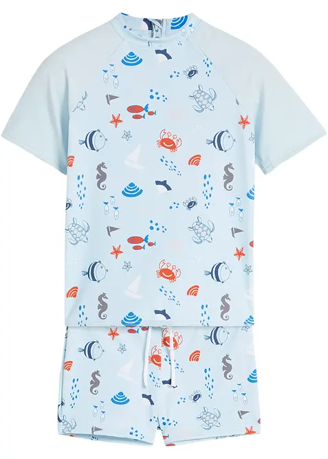 Cooles Badeset für kleine Wasserratten! Dieses 3-teilige Set mit kurzärmeligem Shirt, Badehose und Badekappe im trendigen Hai-Design begeistert jeden Jungen. Aus weicher Polyester-Spandex-Mischung - angenehm auf der Haut, schnell trocknend und atmungsaktiv. Mit praktischem Sonnenschutz für die sensible Kinderhaut. Der elastische Bund der Hose sitzt perfekt und rutscht nicht. Einfach anziehen und ab ins Wasser - ob Meer, See oder Freibad. Das süße Meeresmotiv mit Haien, Fischen und Seesternen weckt die Abenteuerlust. Perfekt abgestimmtes Set für unbeschwerten Badespaß!